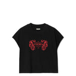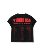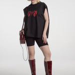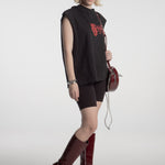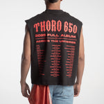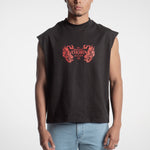 Playera negra de corte boxy sin mangas fabricada en 100% algodón con el diseño de Thoro Grand Hotel acompañado de tigres en el centro del pecho y la lista del Album de Oasis en la espalda todo esto en serigrafía de color rojo.