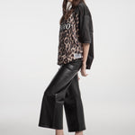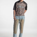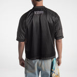 Jersey negro deportivo con diseño tipo jaguar en tela de micro punto transpirable y secado rápido.