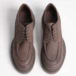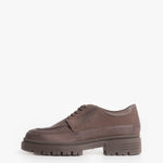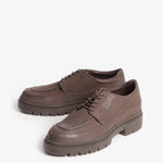El Rat Pack es un zapato estilo Oxford que moderniza la elegancia con una base robusta. Está confeccionado en piel color café de tono oscuro, que ofrece un look monocromático y muy versátil. Su diseño clásico de costura en "U" se asienta sobre una suela chunky, gruesa y con tracción, que le da un aspecto moderno.