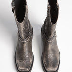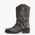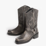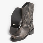 La bota Sequía es un calzado western, favorita entre los bikers. Confeccionada en piel negra con un acabado lavado y desgastado que le da una textura que evoca el paso del tiempo y el camino. Destaca por las costuras tradicionales en la caña y una correa de arnés con herrajes metálicos que cruza el empeine. Con su punta cuadrada y un tacón bajo, esta bota es ideal para quien busca un estilo auténtico, robusto y con un carácter fuerte.
