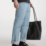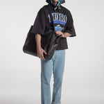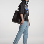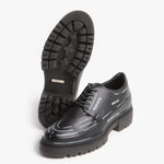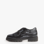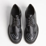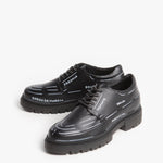 Zapato de suela gruesa fabricado en piel color negro, con lineas y los nombres de las partes del calzado pintados a mano en blanco.