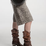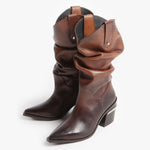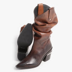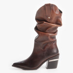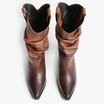 Bota vaquera con tubo arrugado fabricada en piel de res con degradado de oscuro a claro color miel, con tacón cubano con placa metálica