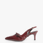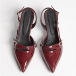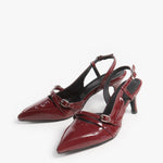 El zapato Darling es un Stileto de tacón clásico con un giro moderno. Está confeccionado en piel charol color vino, que le da un acabado brillante y lujoso. El diseño destaca por su punta afilada y las dos finas correas que cruzan el empeine.