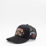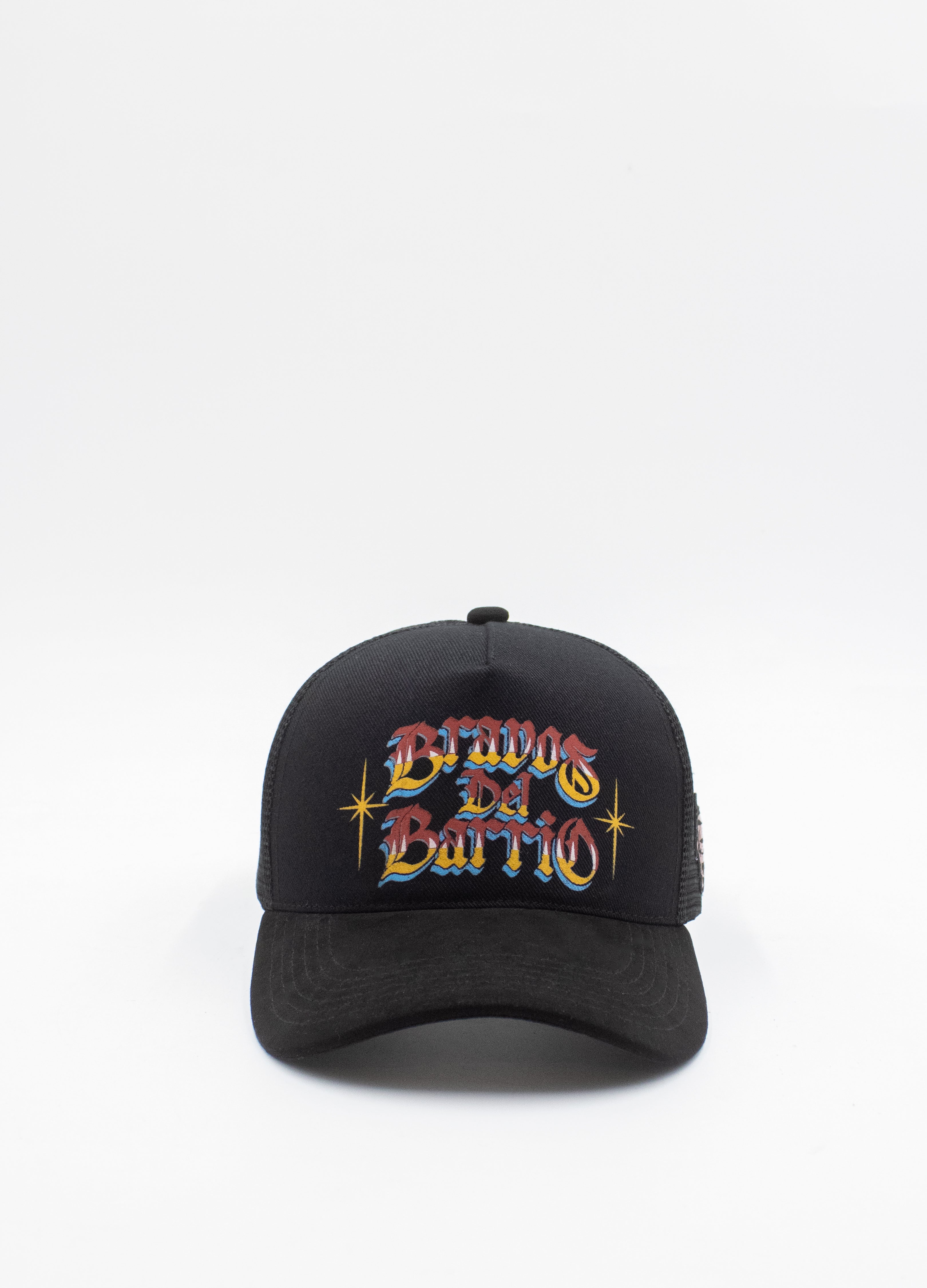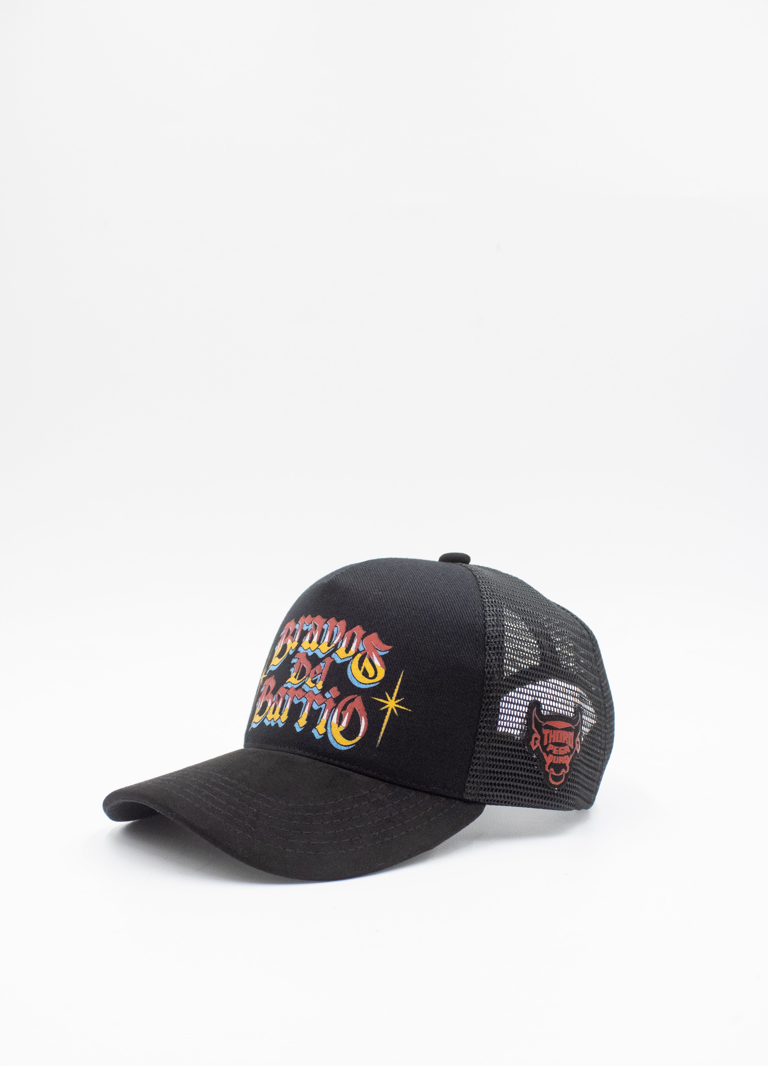 La gorra Bravos del Barrio es un accesorio clave de la colaboración Thoro x PegaDuro que rinde homenaje a la gráfica popular de los barrios mexicanos. Con un diseño tipo trucker en color negro, destaca por el bordado frontal multicolor de "Bravos Del Barrio" en una tipografía de estilo rotulación urbana. Incluye paneles de malla para mayor frescura y un parche lateral con el logo del toro en llamas característico de esta unión.