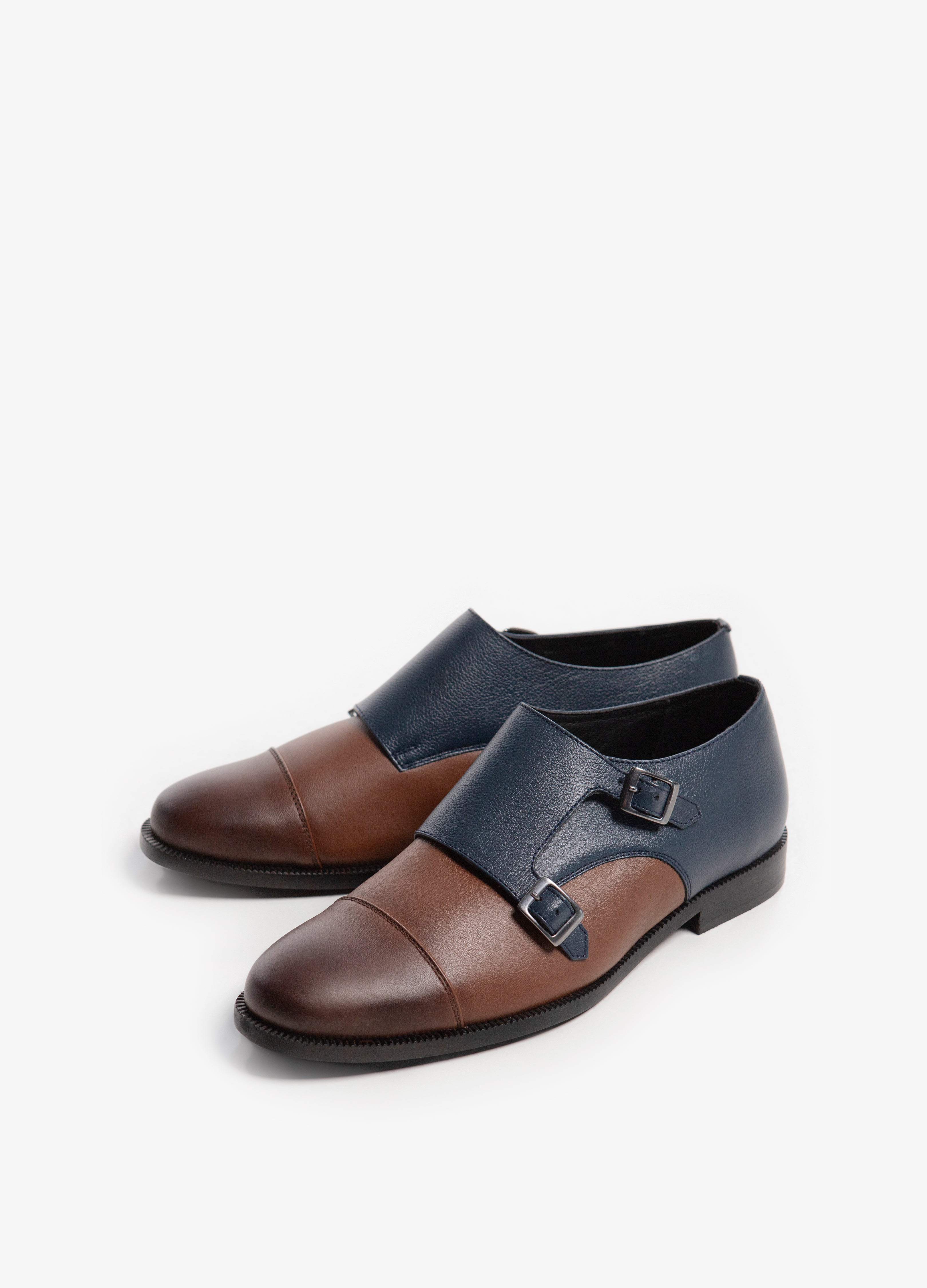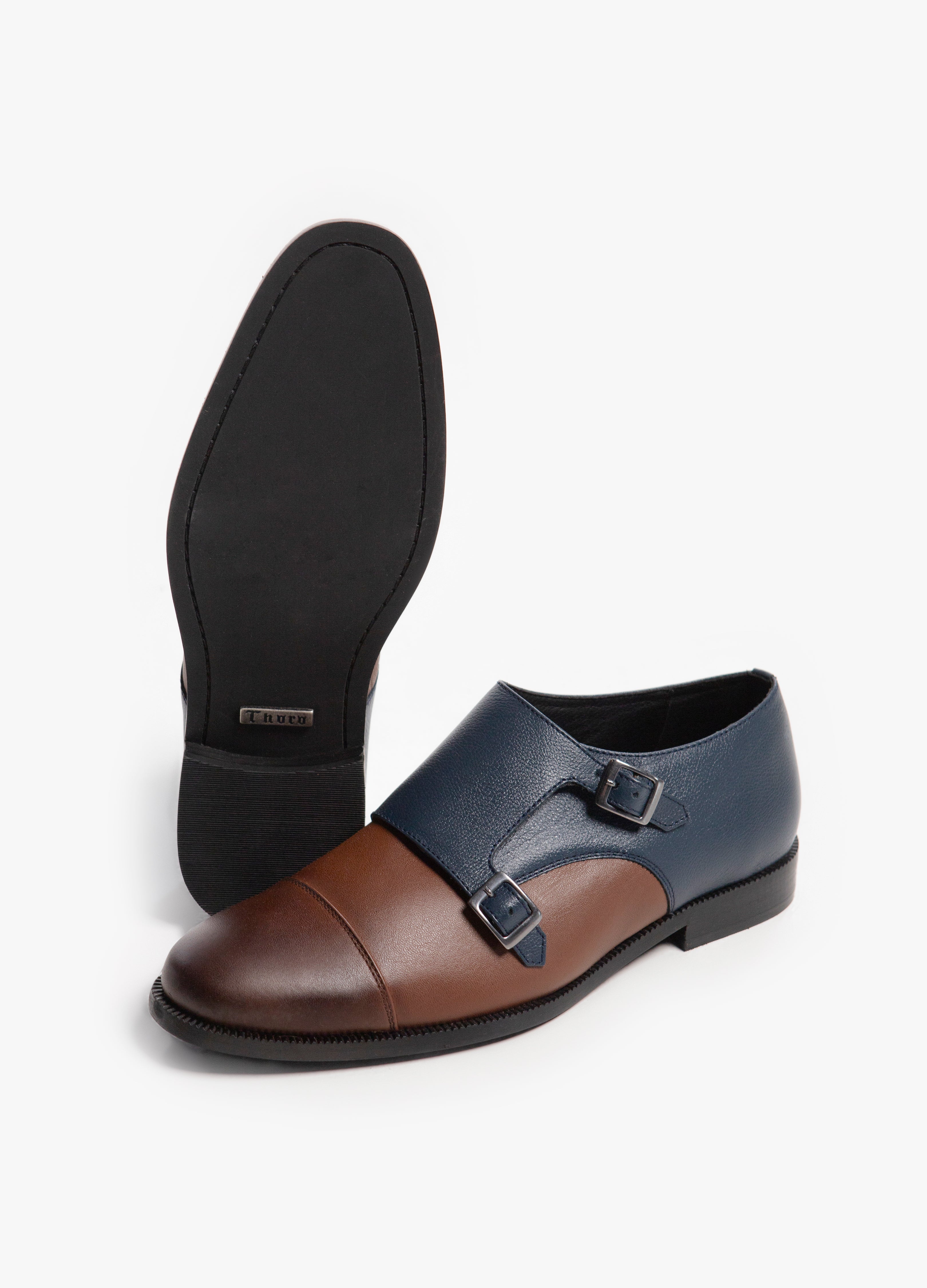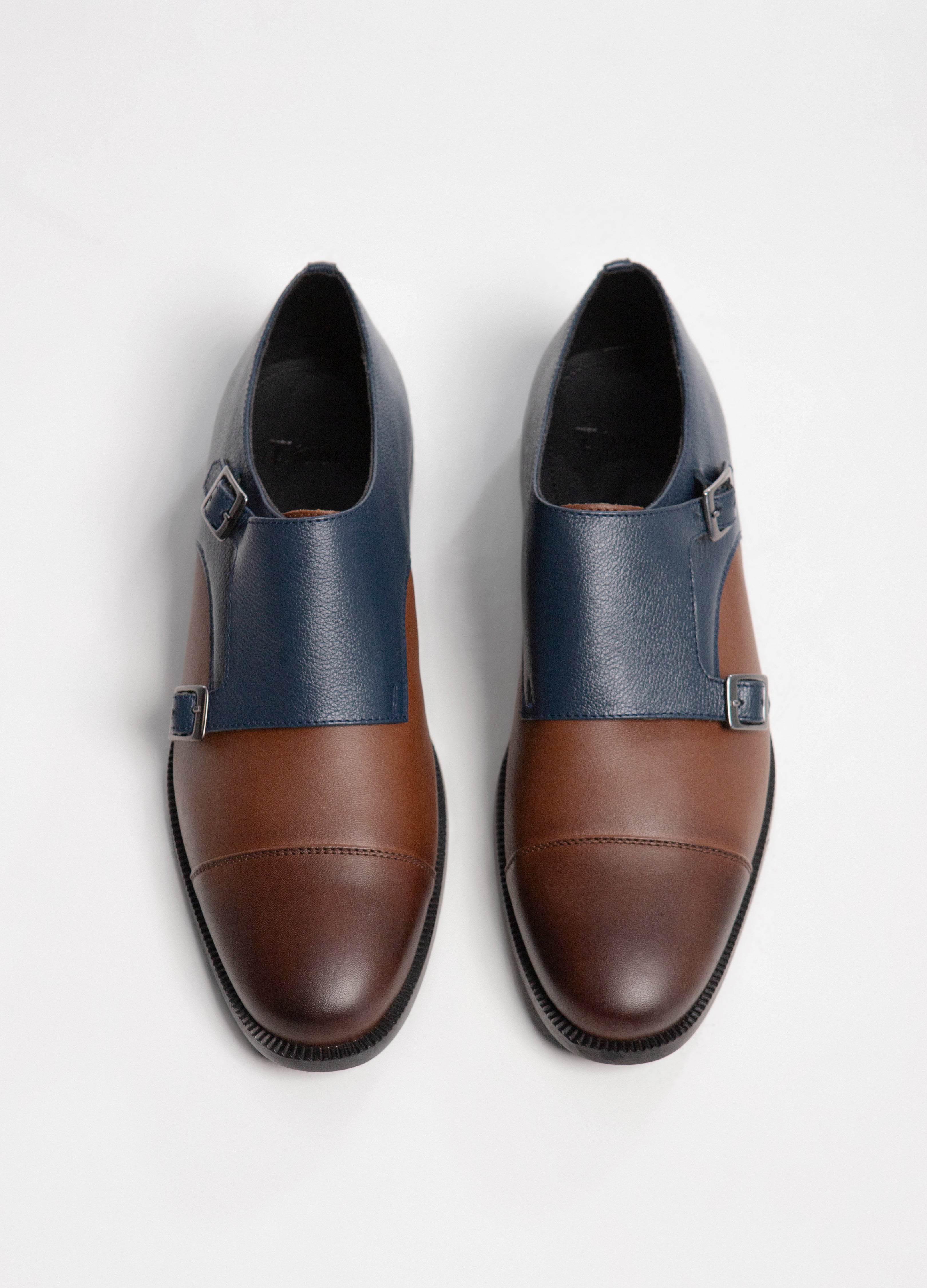 Buckle shoe made of cowhide in two colors: navy and honey.