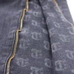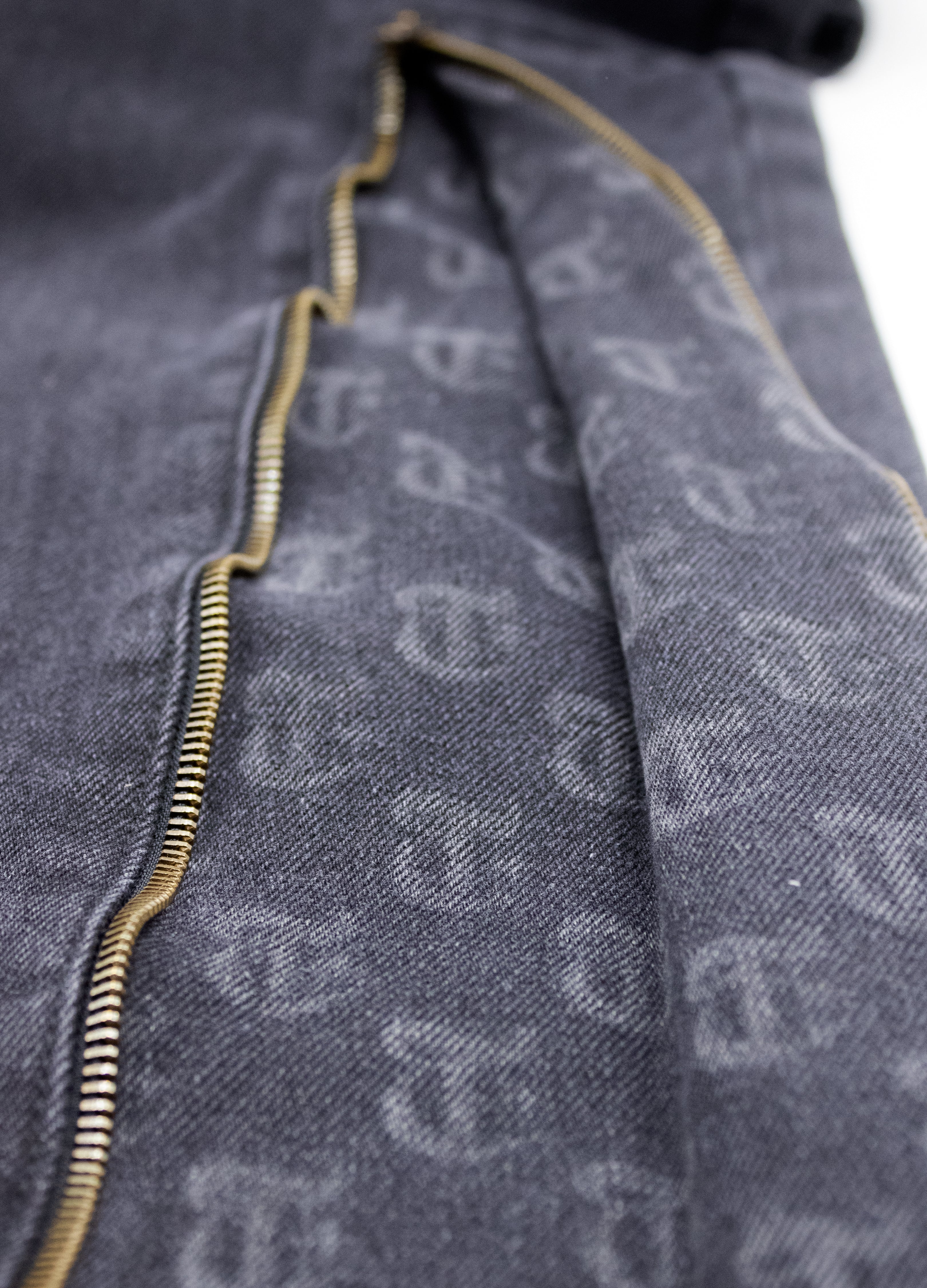 Pants made of 100% black denim with zippers at the bottom to make them straighter pants when closed or more flared when opened, they have a laser-engraved T-letter pattern and front design is embroidered on a worn cut, captions "Bestial Club" in Gothic letters.