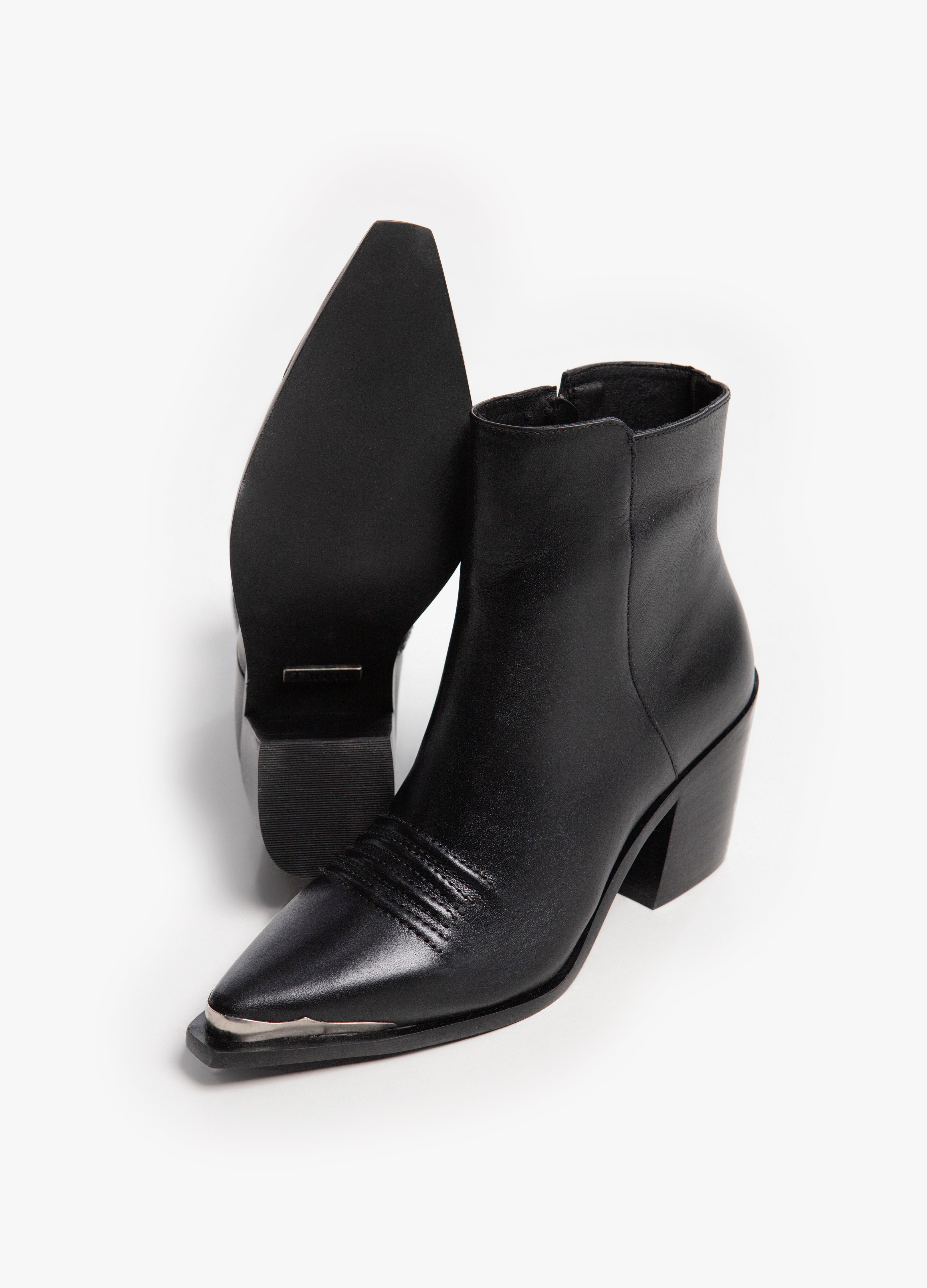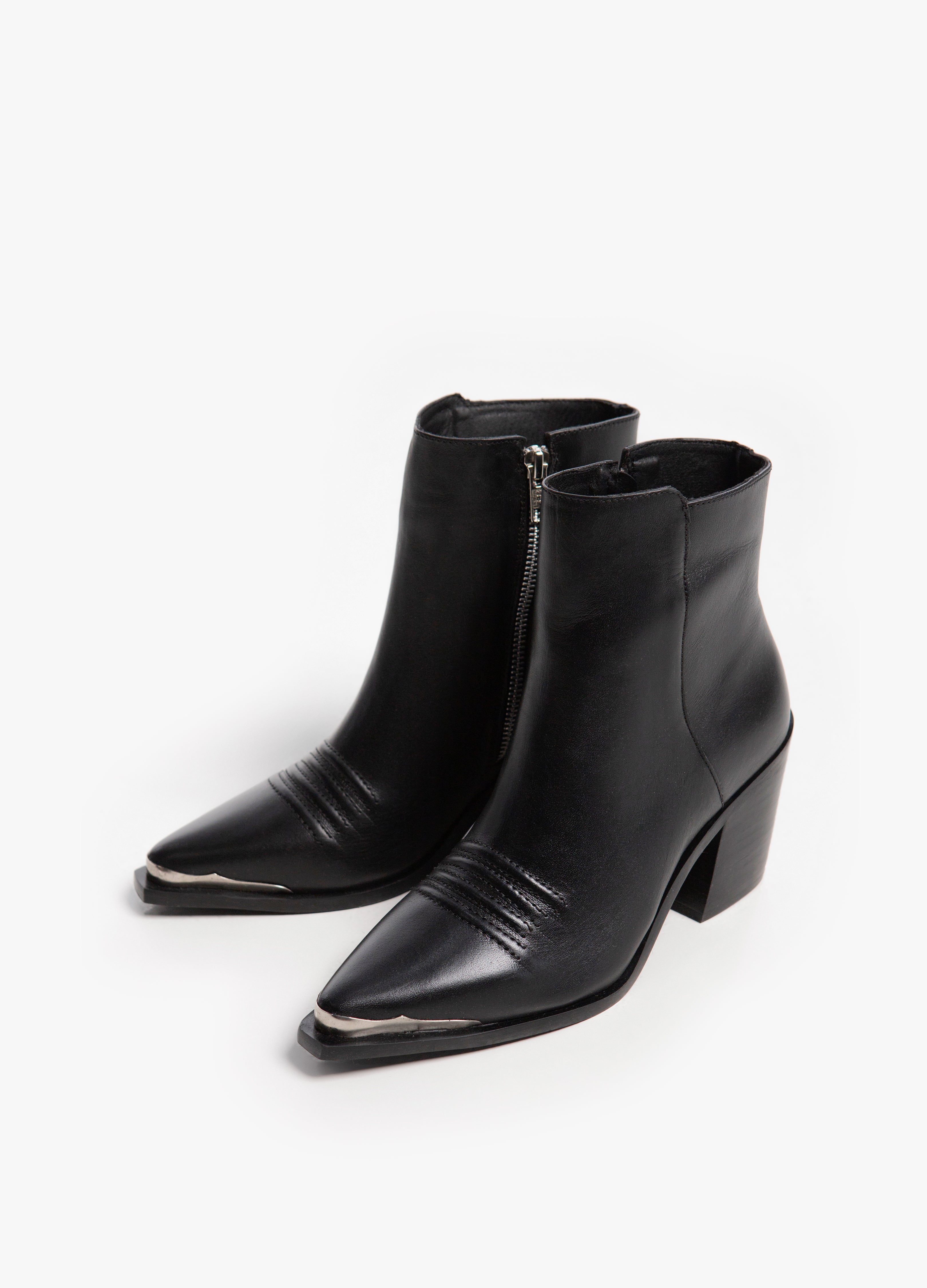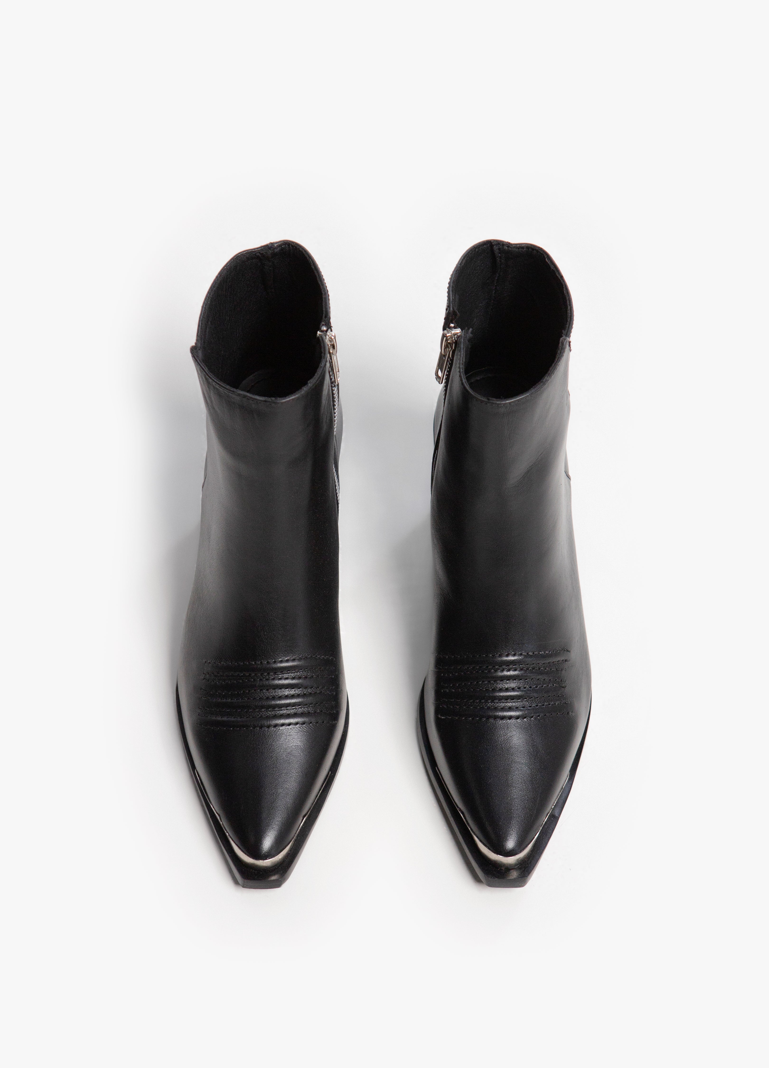 Chelsea boot made of black cowhide with a Cuban heel, embroidered reliefs on the instep, metal side closure and metal toe.