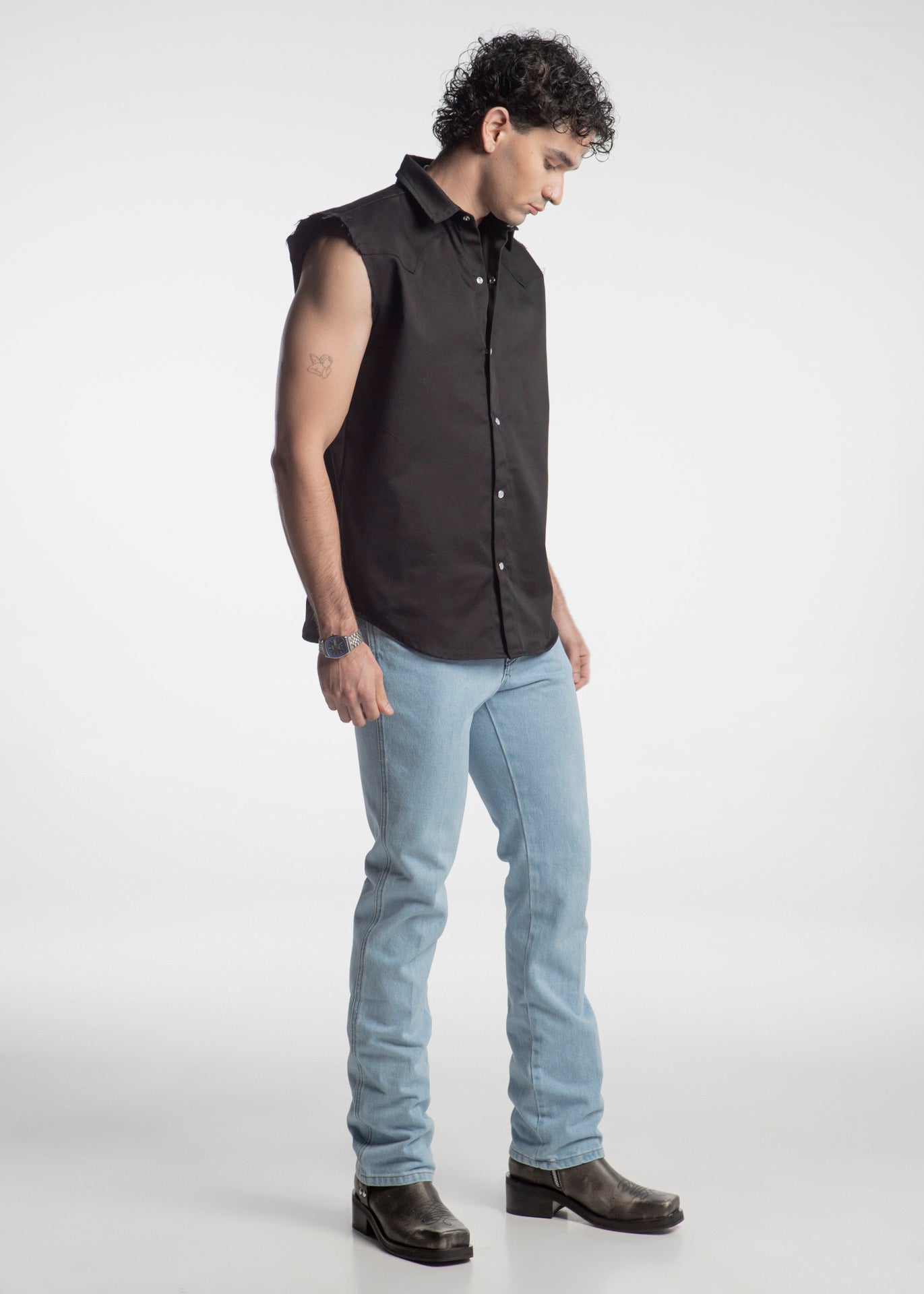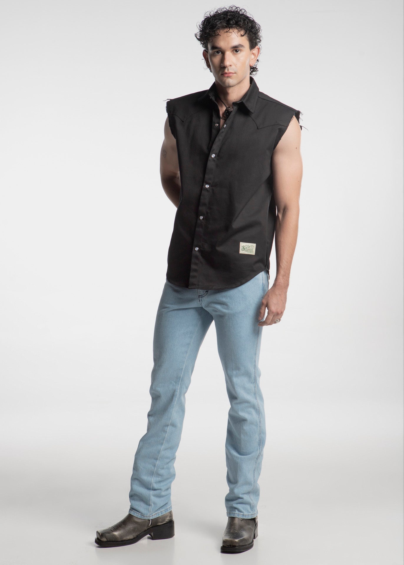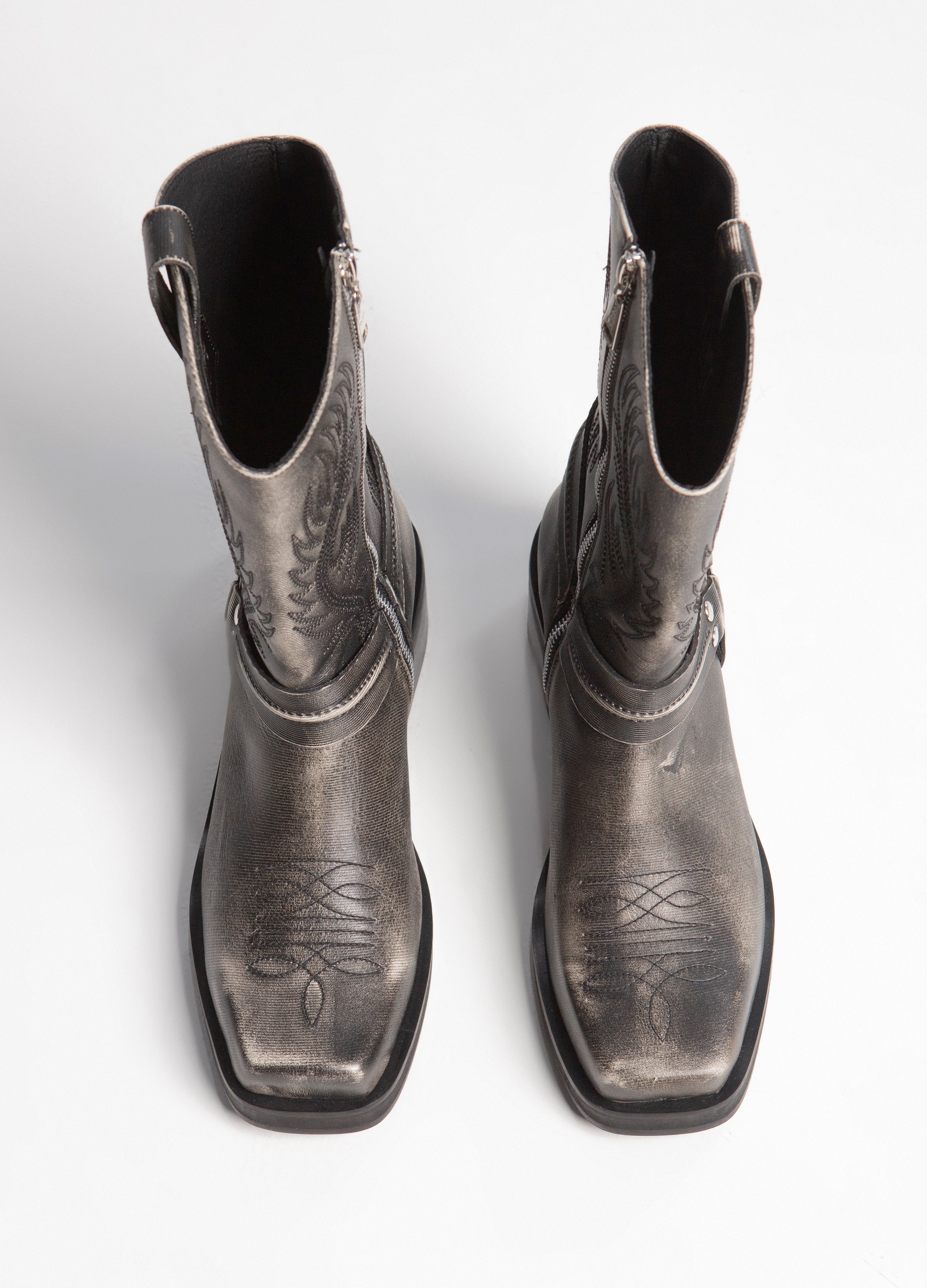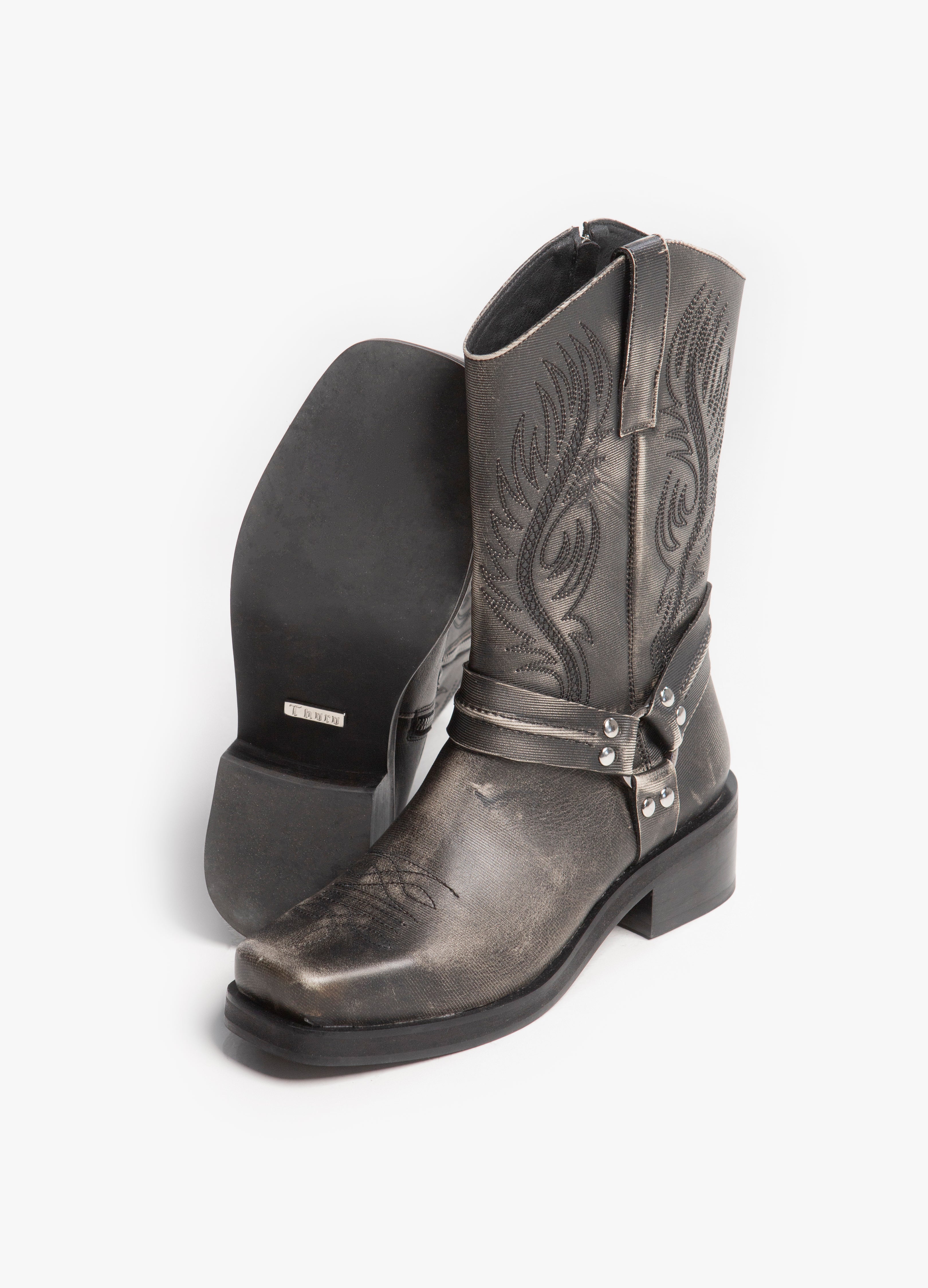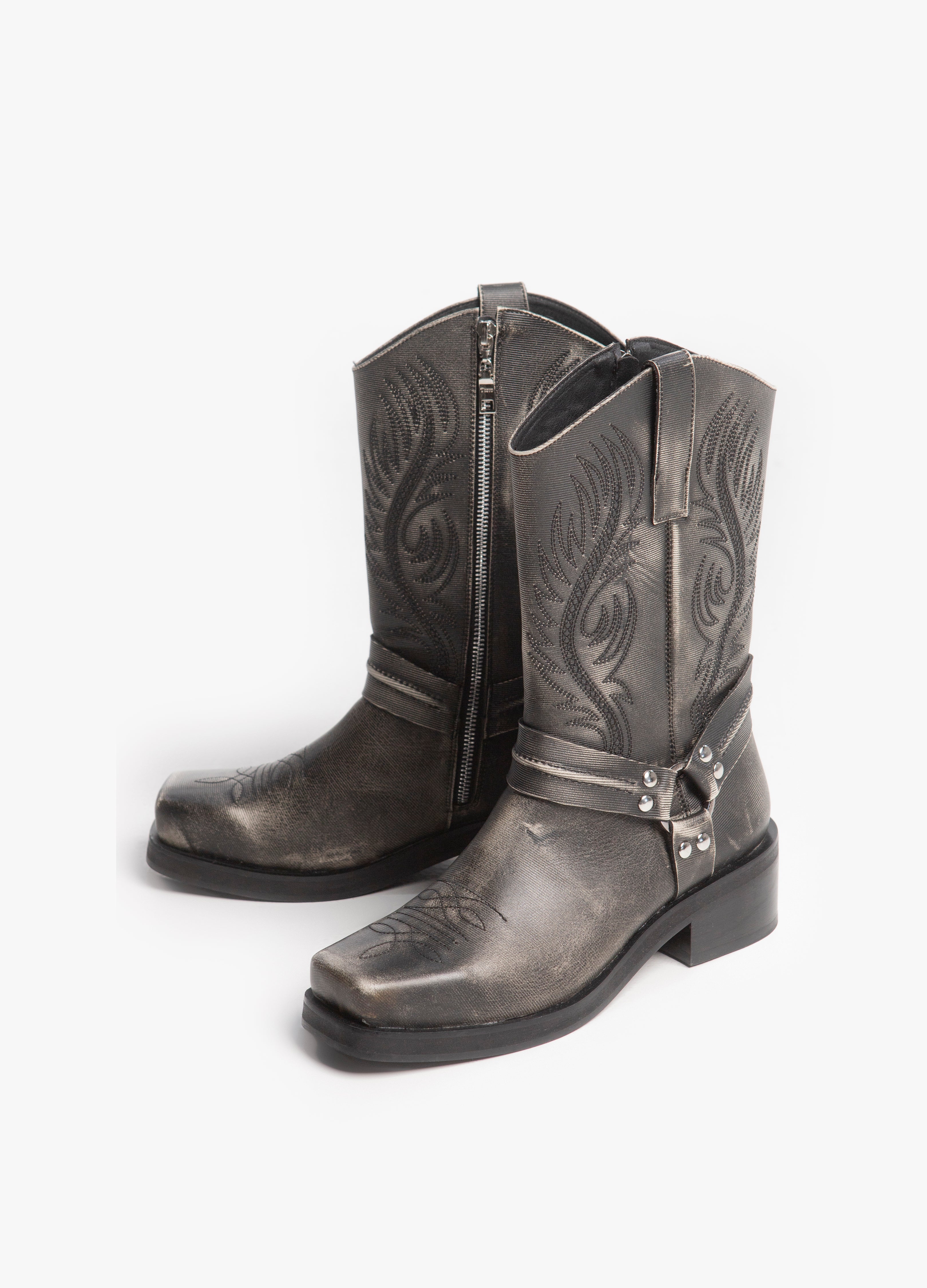 La bota Sequía es un calzado western, favorita entre los bikers. Confeccionada en piel negra con un acabado lavado y desgastado que le da una textura que evoca el paso del tiempo y el camino. Destaca por las costuras tradicionales en la caña y una correa de arnés con herrajes metálicos que cruza el empeine. Con su punta cuadrada y un tacón bajo, esta bota es ideal para quien busca un estilo auténtico, robusto y con un carácter fuerte.