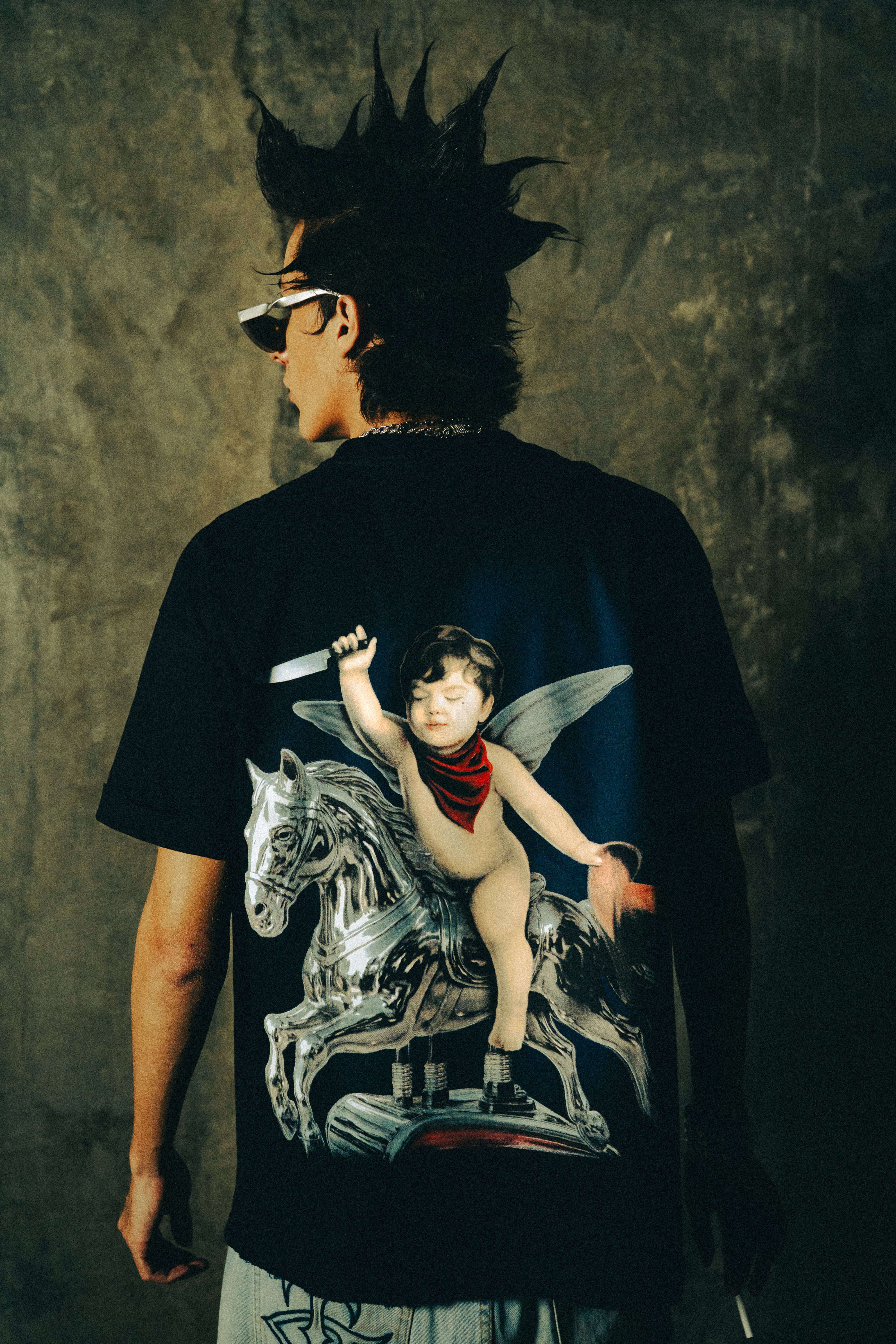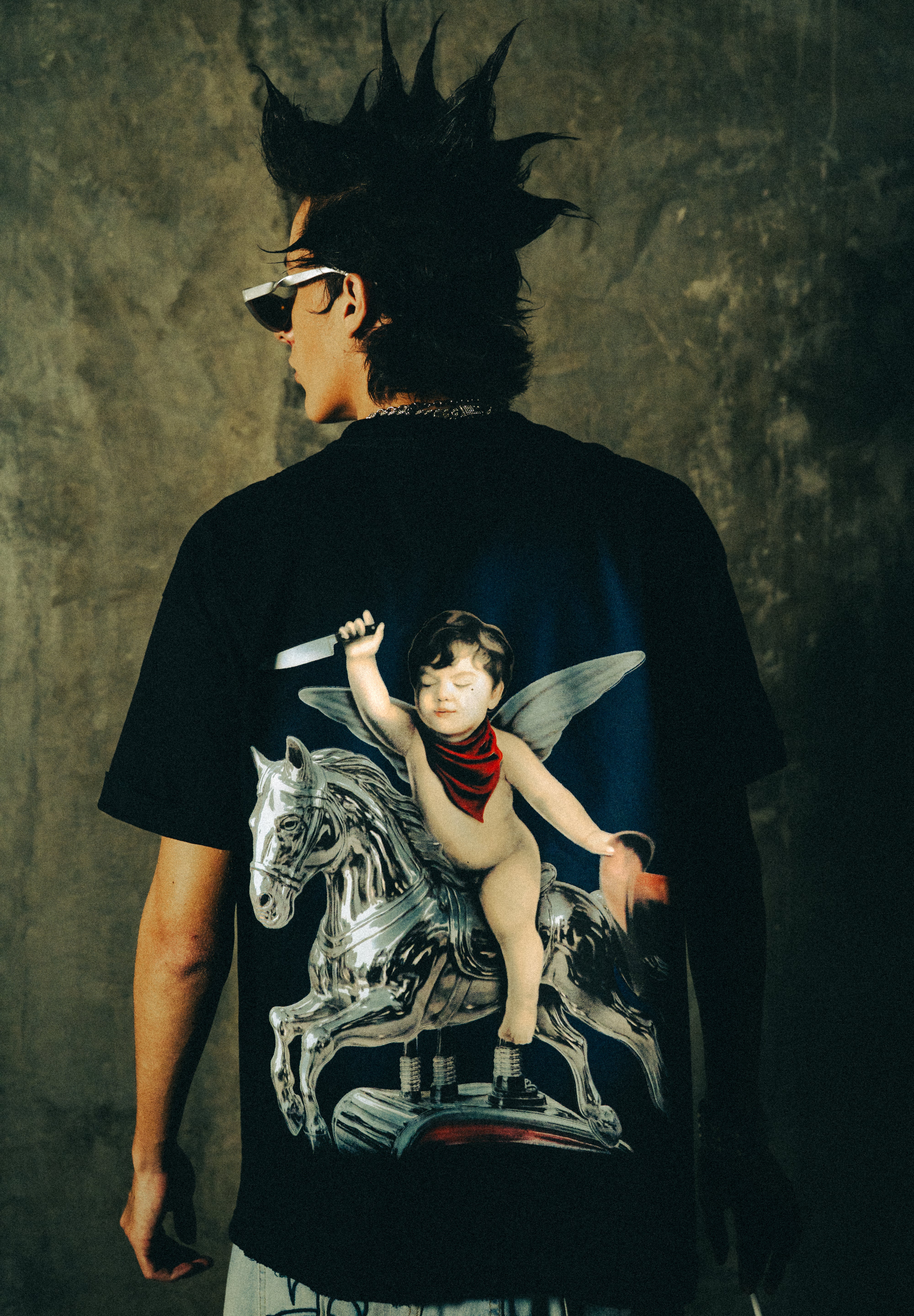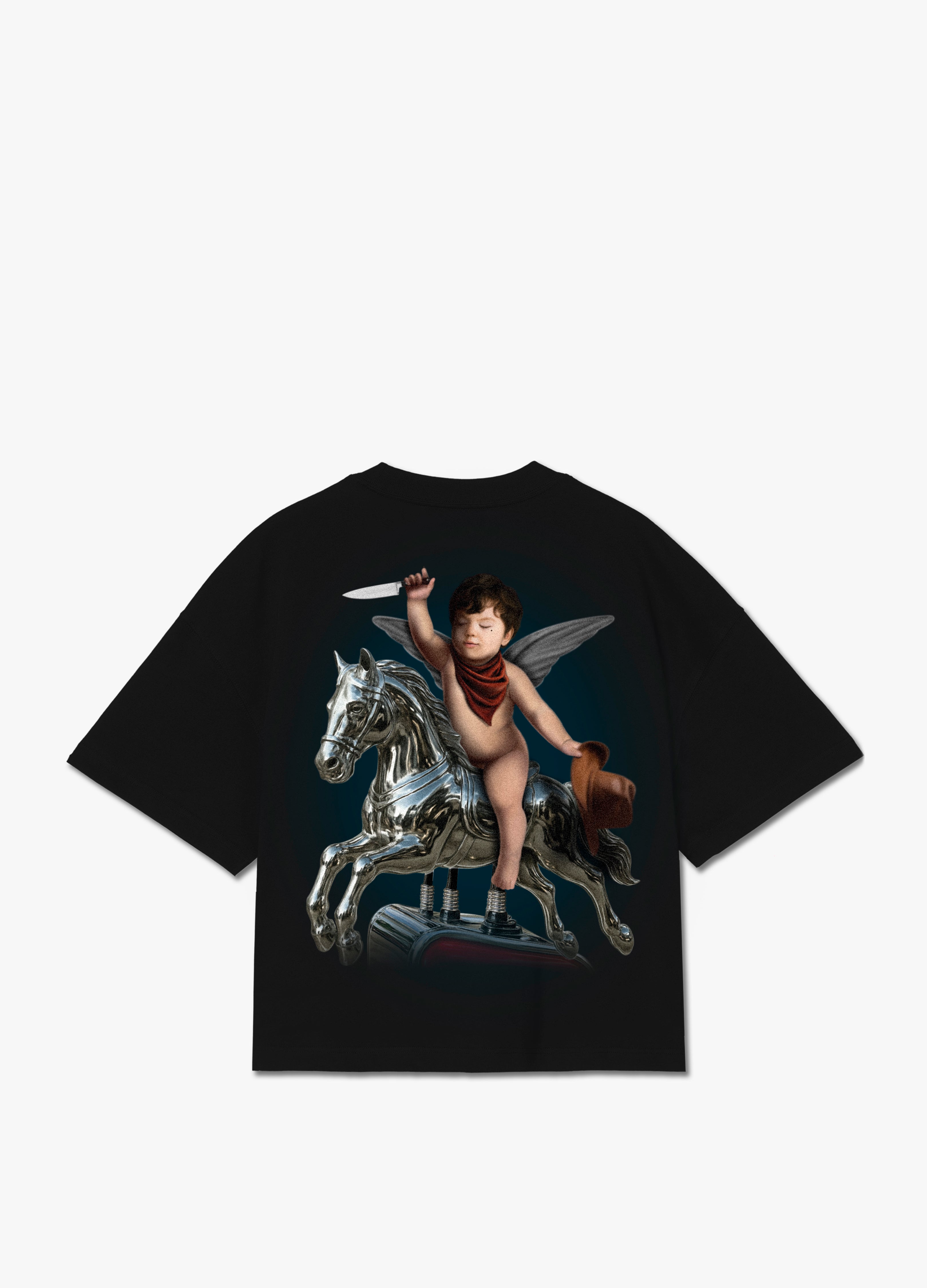 Es una playera oversized negra con un gráfico en la espalda luce un cupido con una daga montando un caballo mecánico cromado, mientras que el pecho lleva el logo de la colaboración y cinco estrellas blancas.
