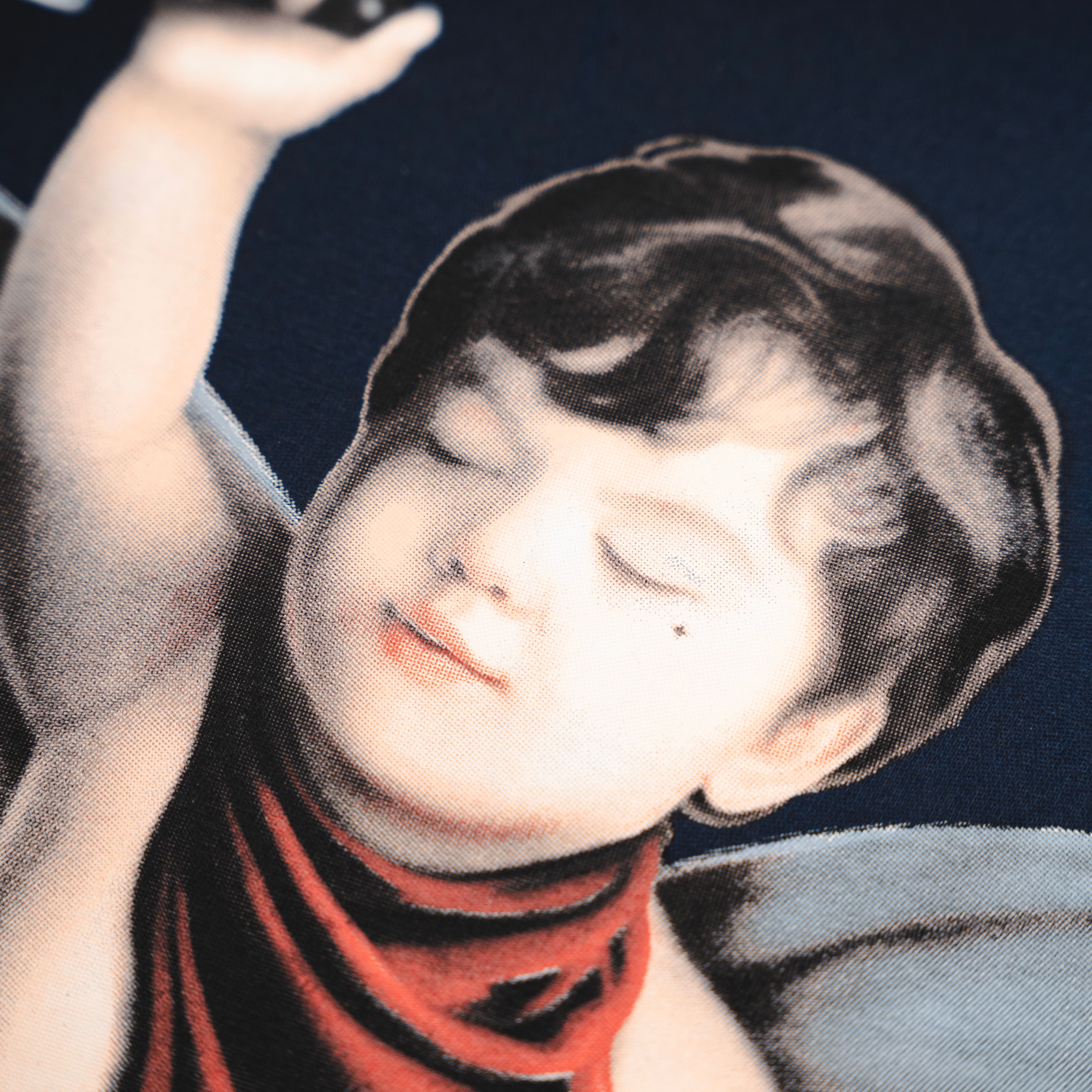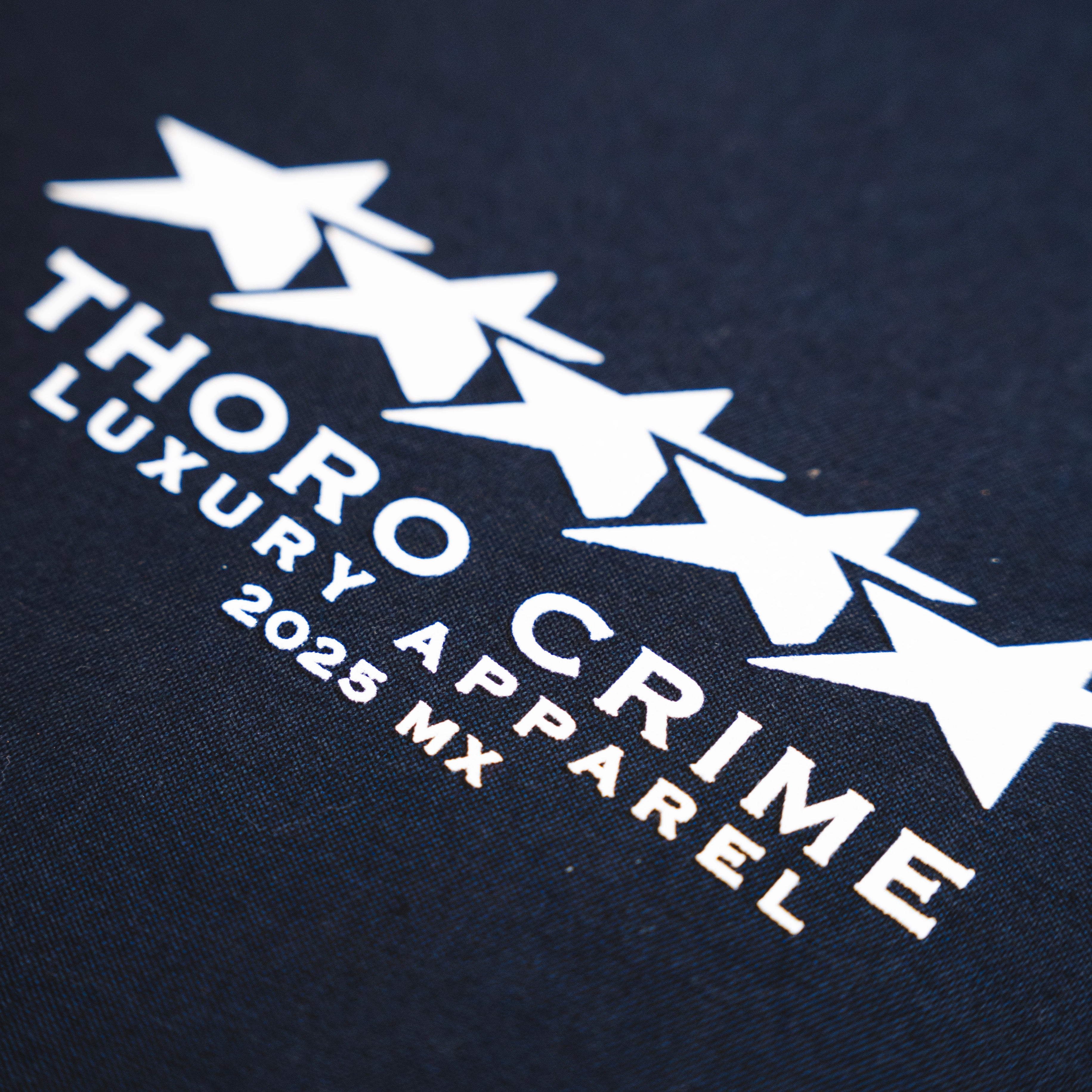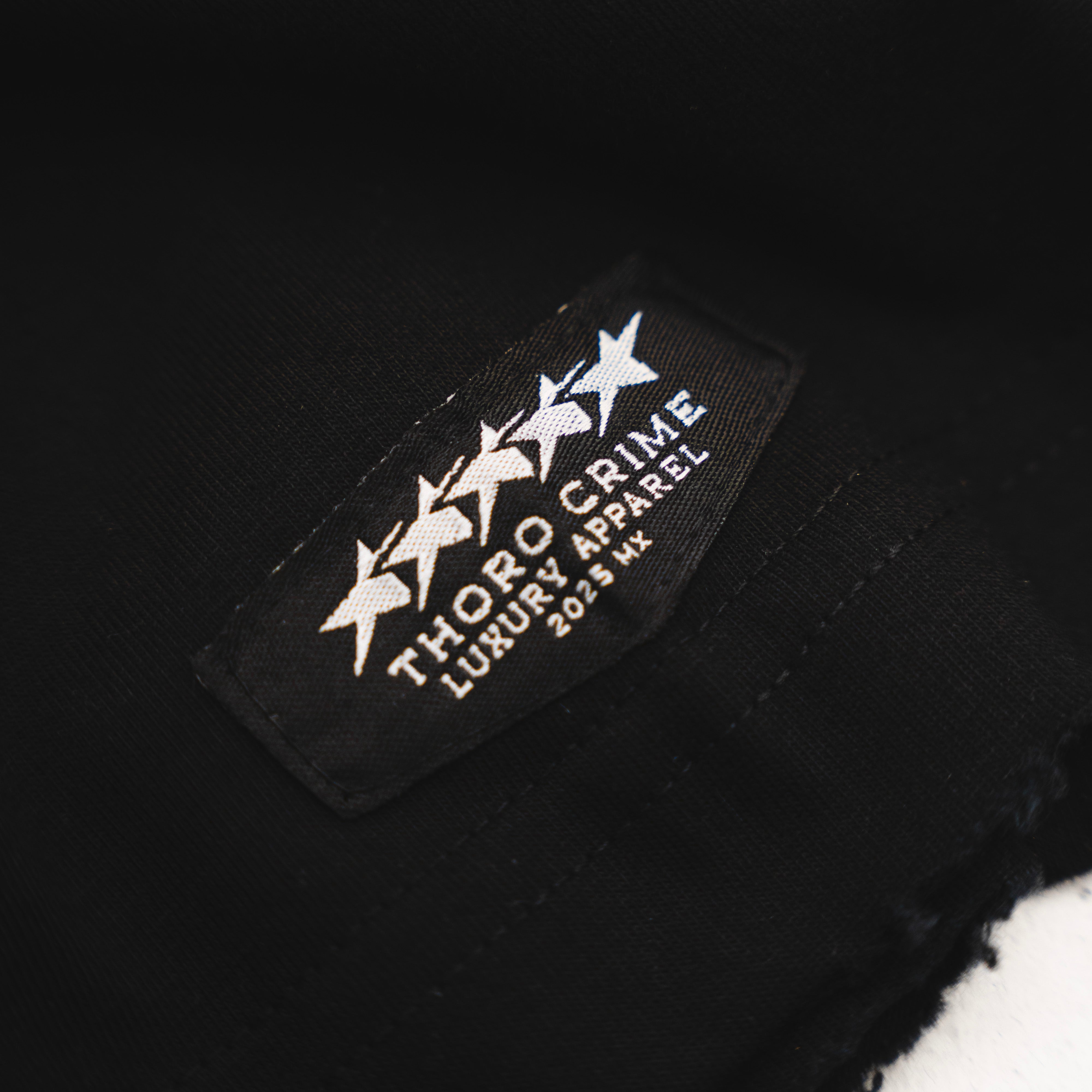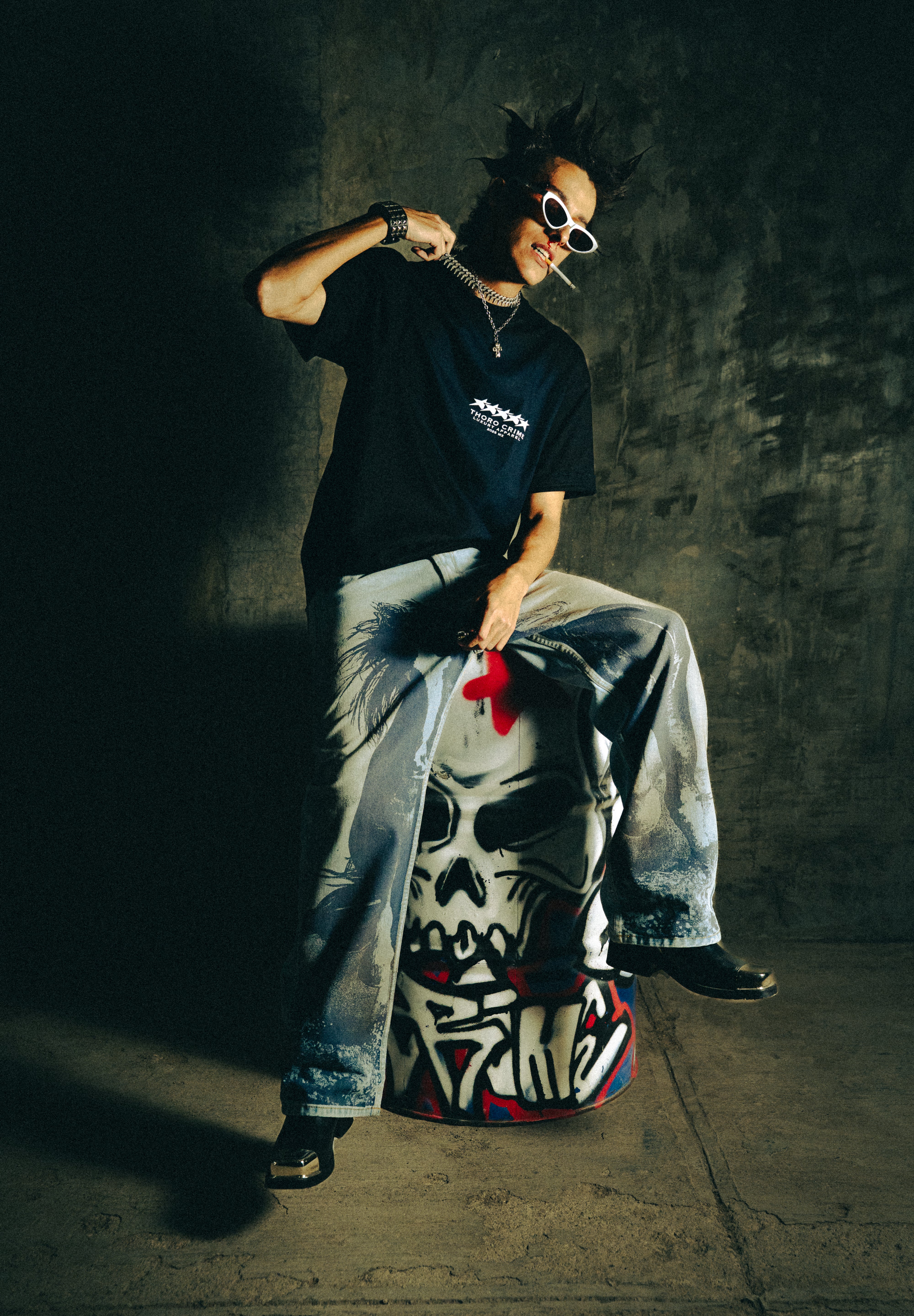 Es una playera oversized negra con un gráfico en la espalda luce un cupido con una daga montando un caballo mecánico cromado, mientras que el pecho lleva el logo de la colaboración y cinco estrellas blancas.