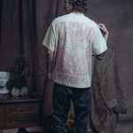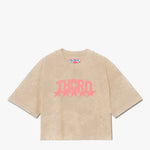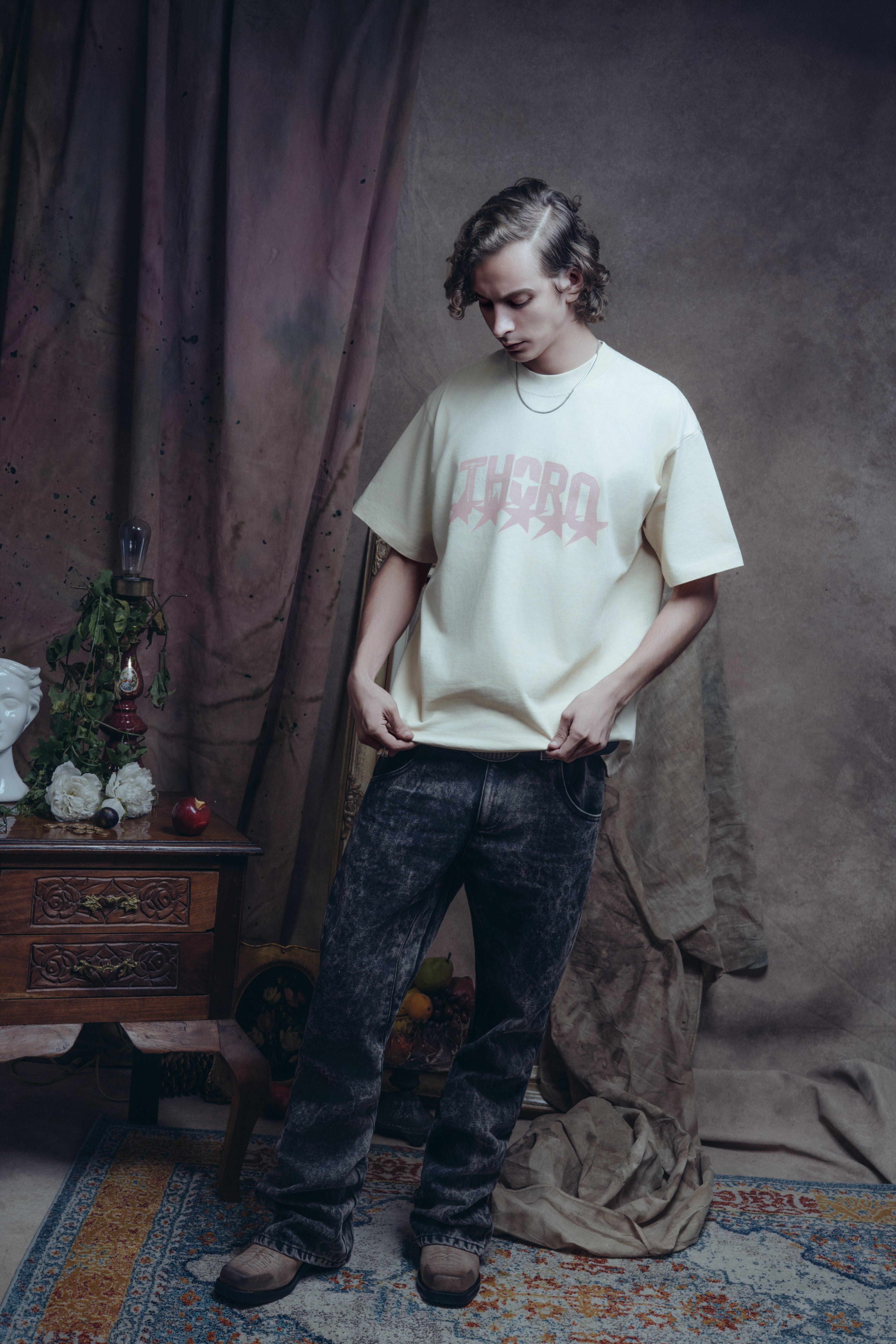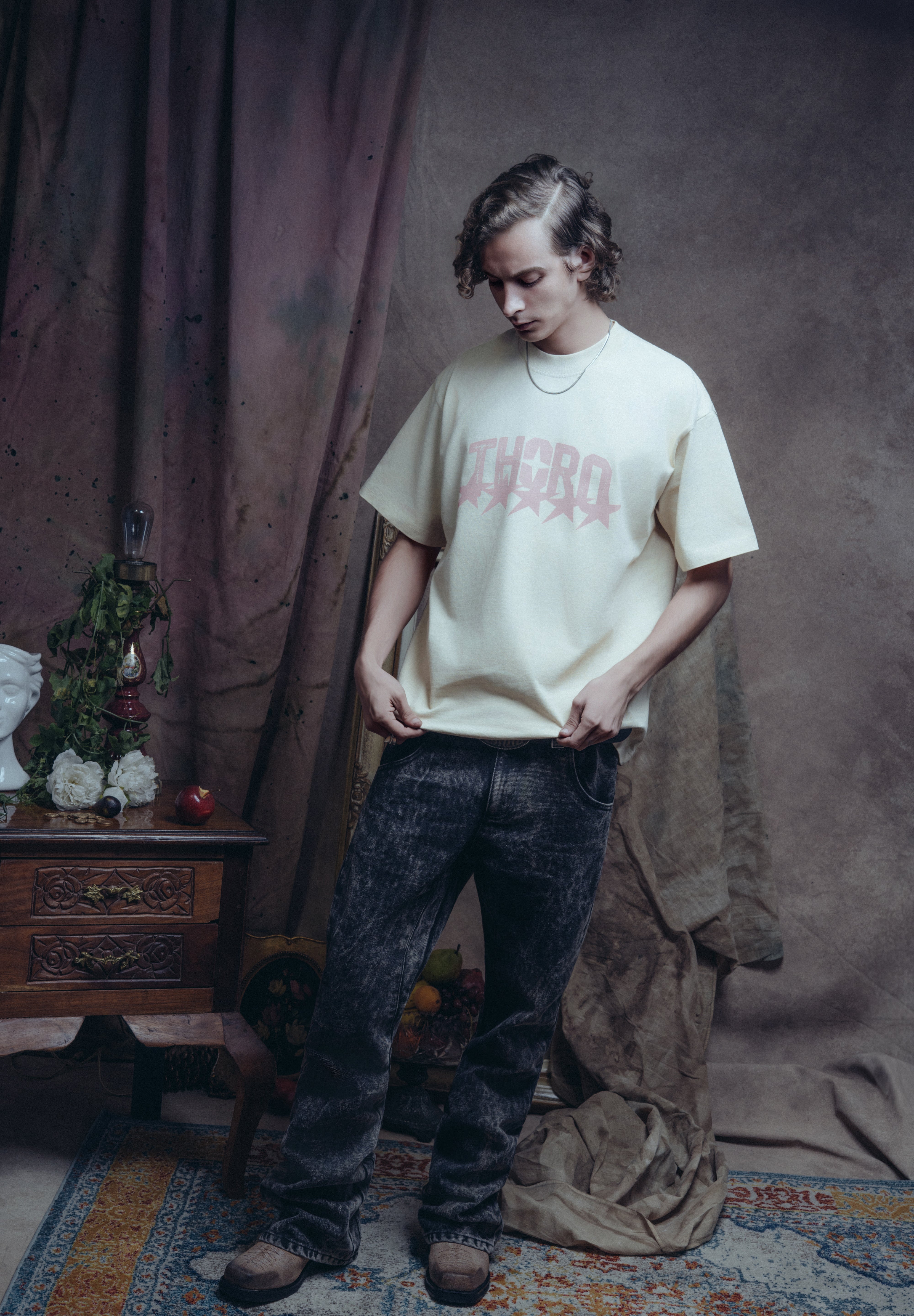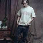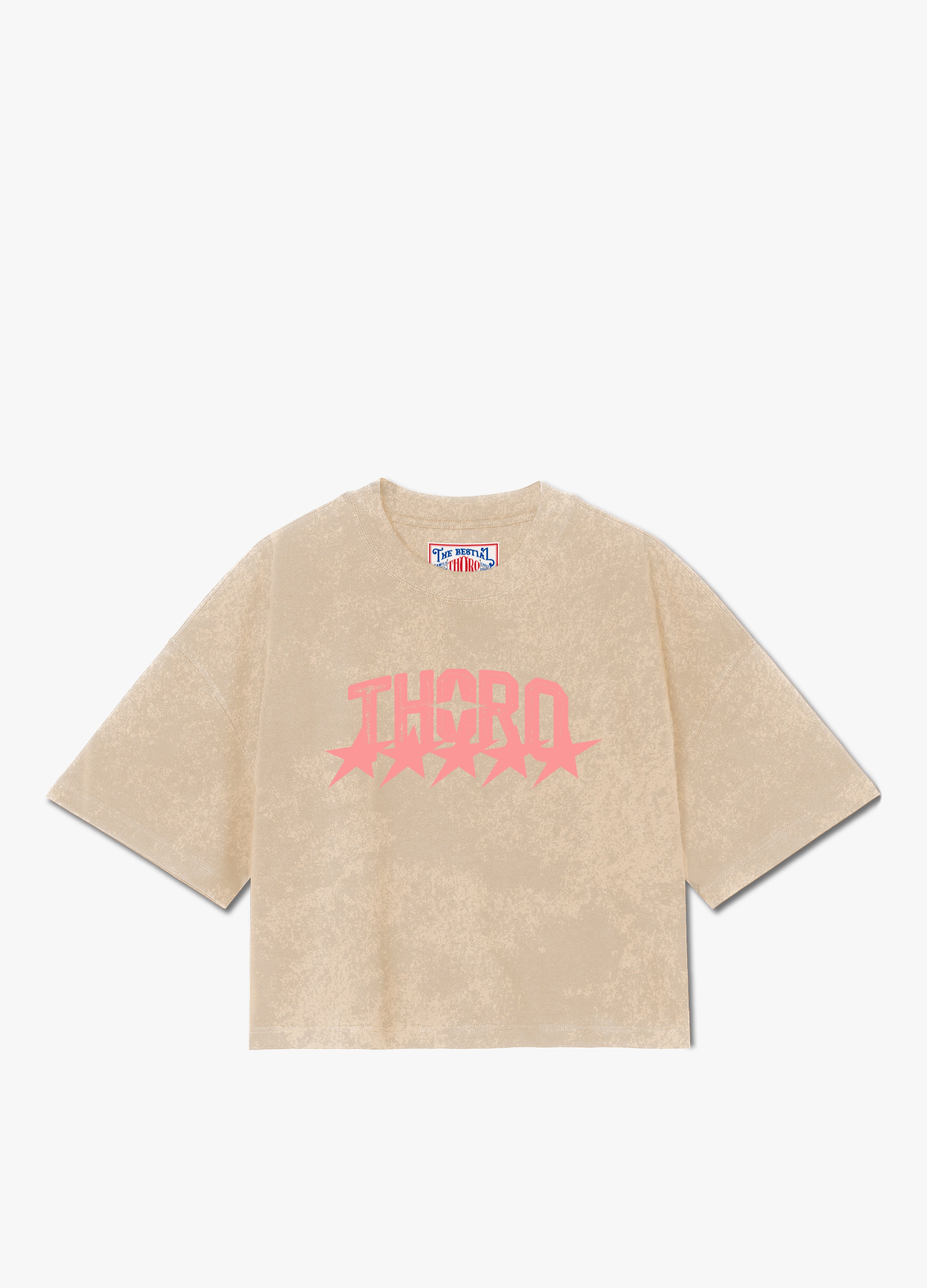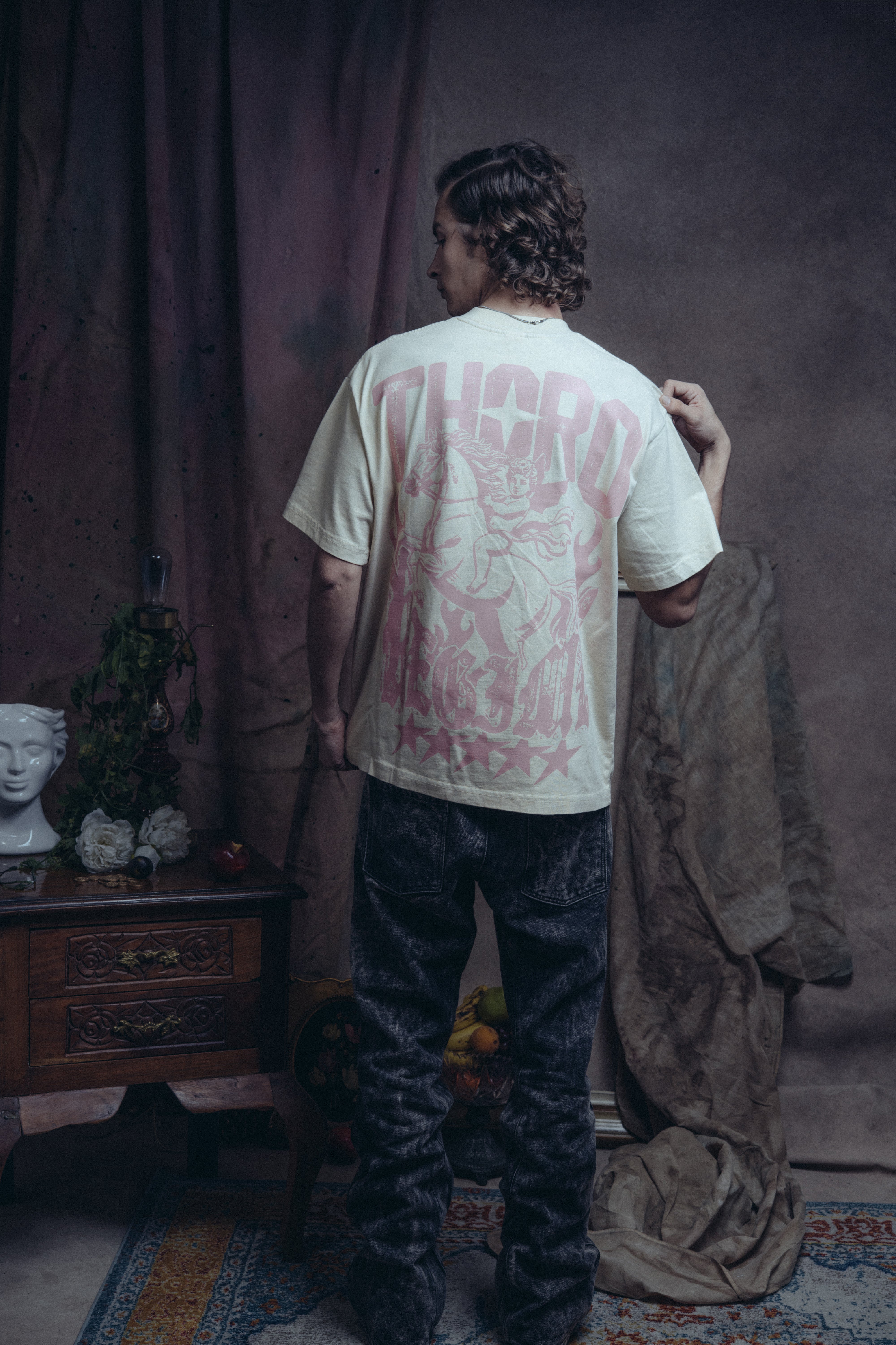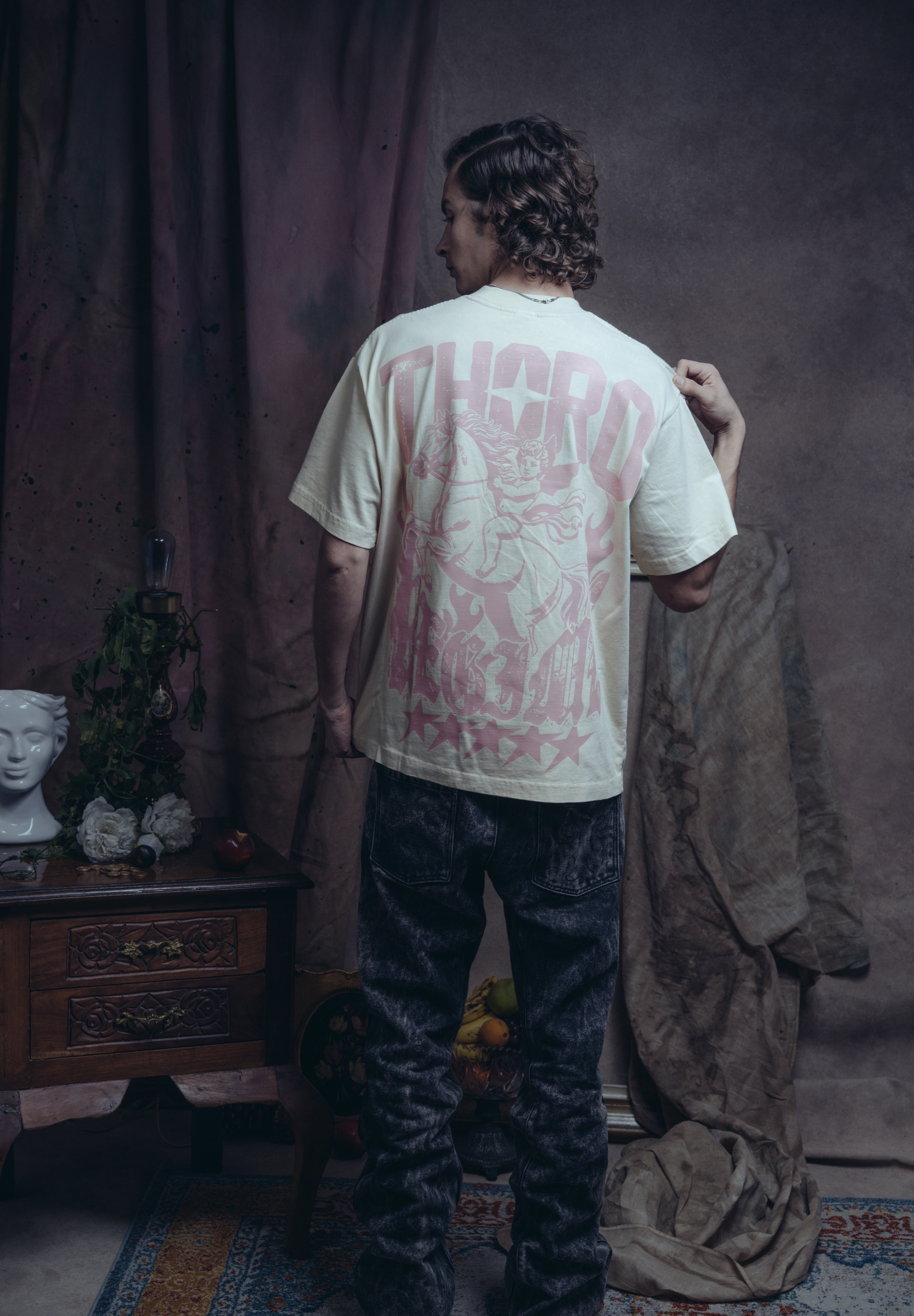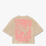 La camiseta Jinete Alado es una prenda de la Colección Mala Fama que fusiona la estética western con un toque de fantasía. Confeccionada en un tela arena con un acabado desgastado, presenta el logo THORO en color rosa. El print trasero es un gráfico de un jinete a caballo rodeado de flamas y estrellas.