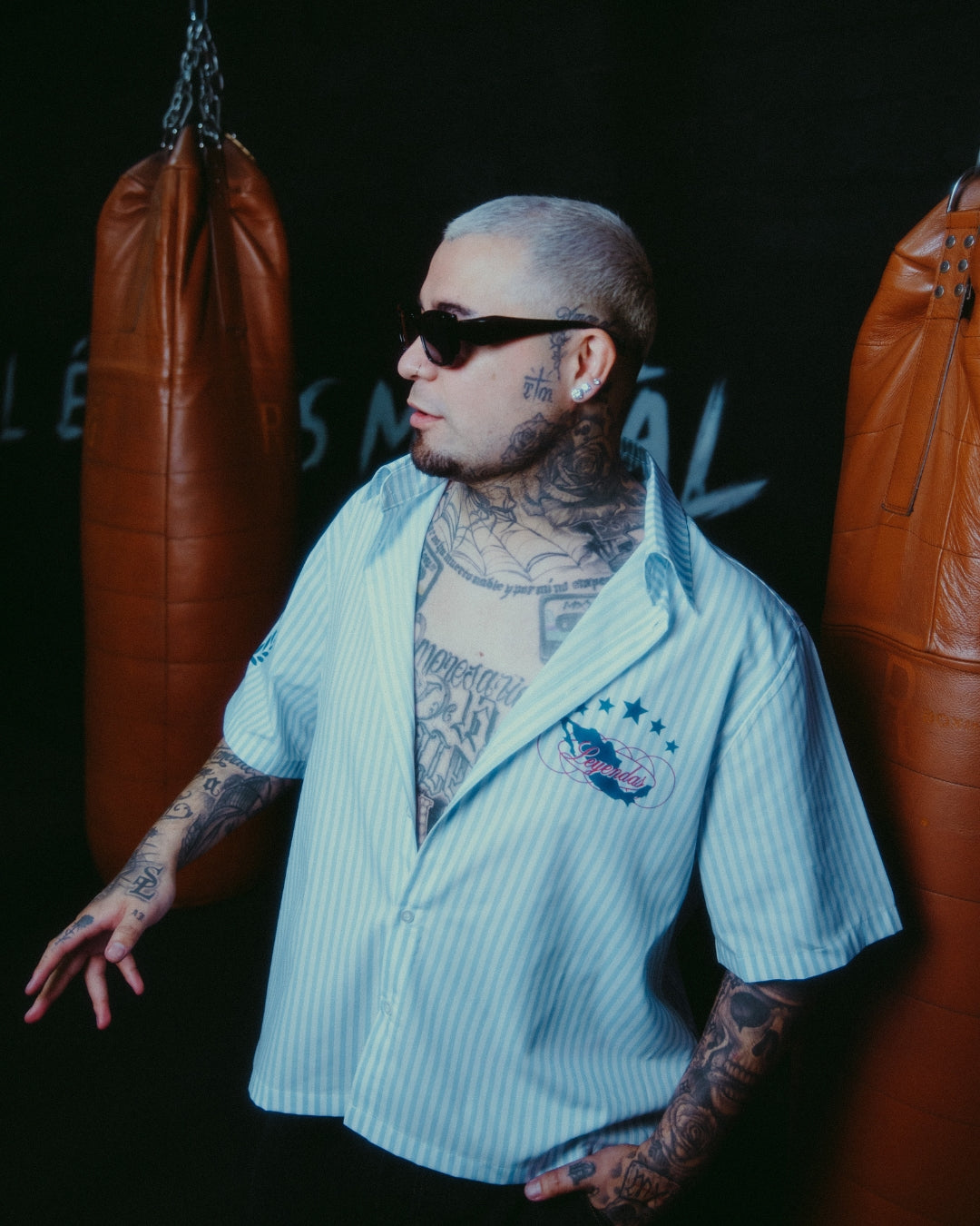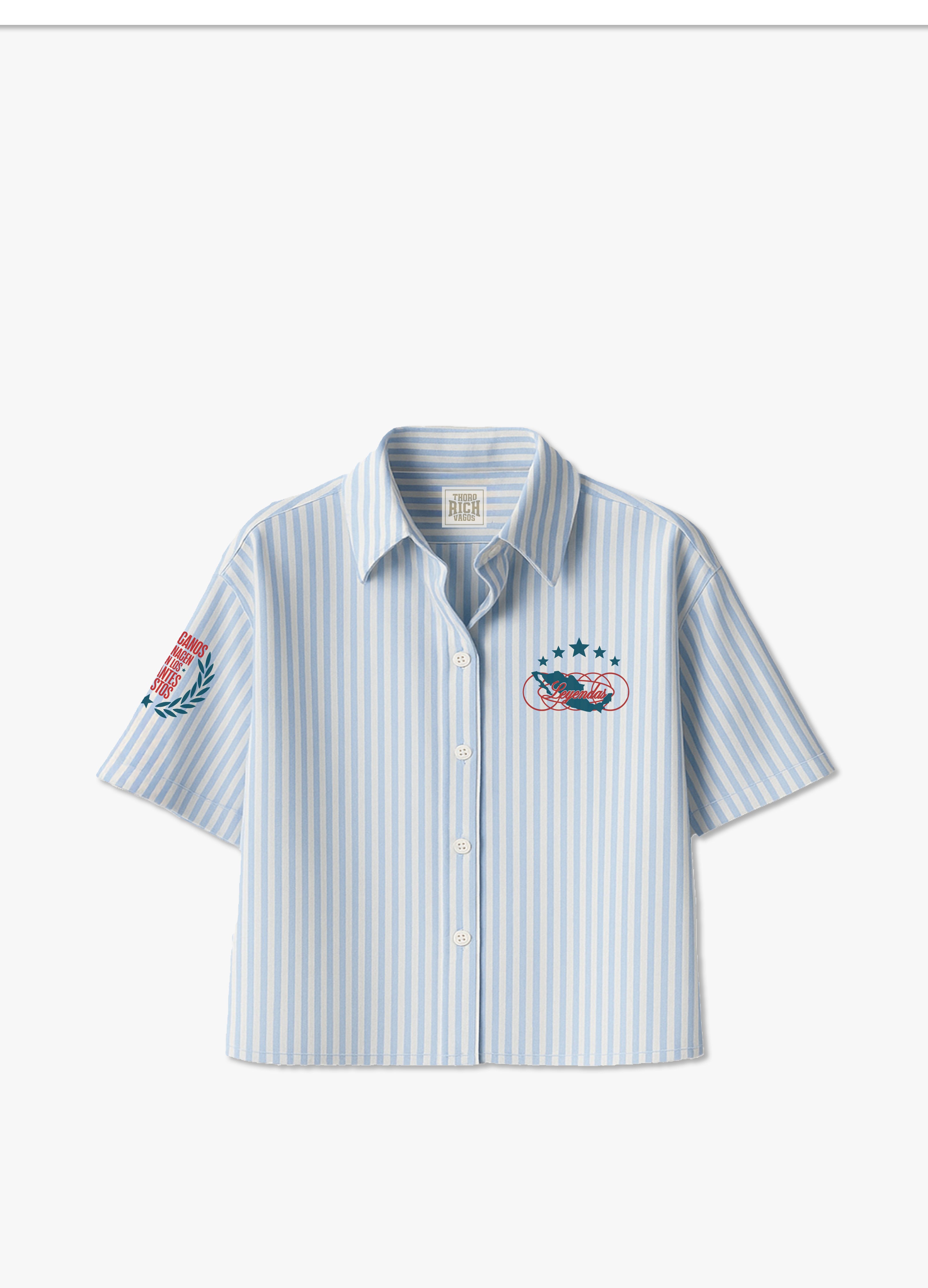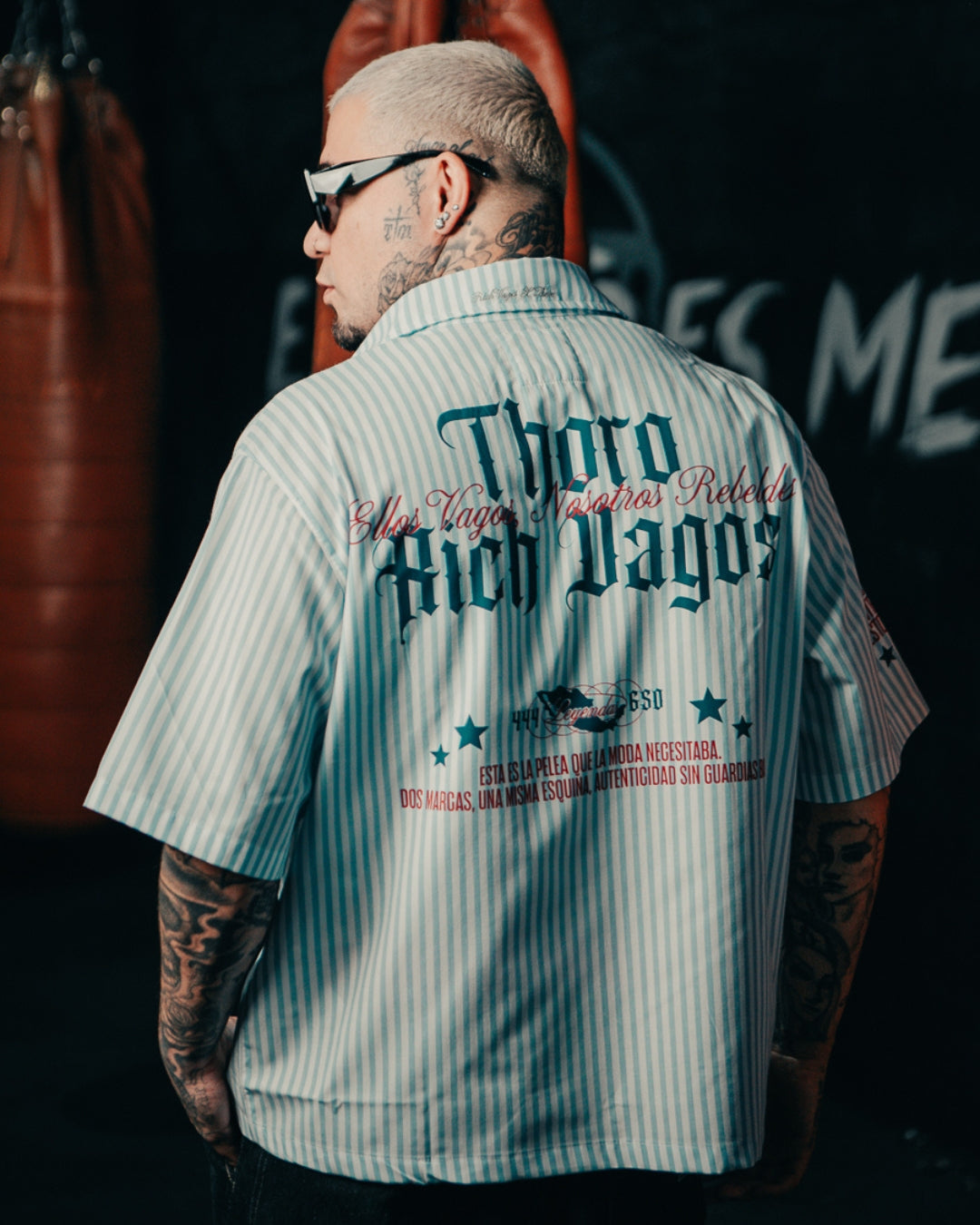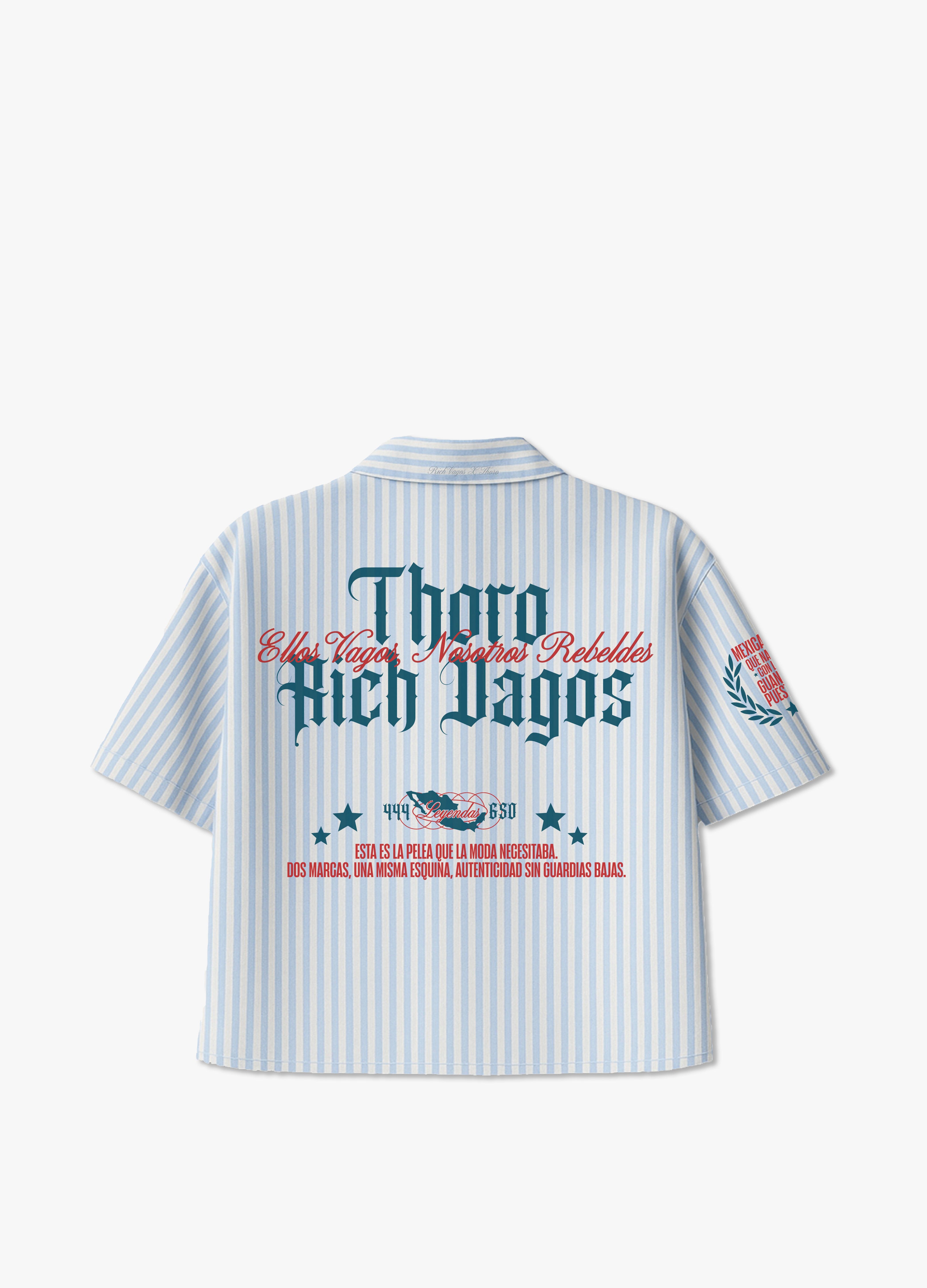 Camisa de botones en color Azul en rayas con diseño en pecho de jalisco, manga derecha y diseño de Thoro x Rich Vagos en parte trasera.