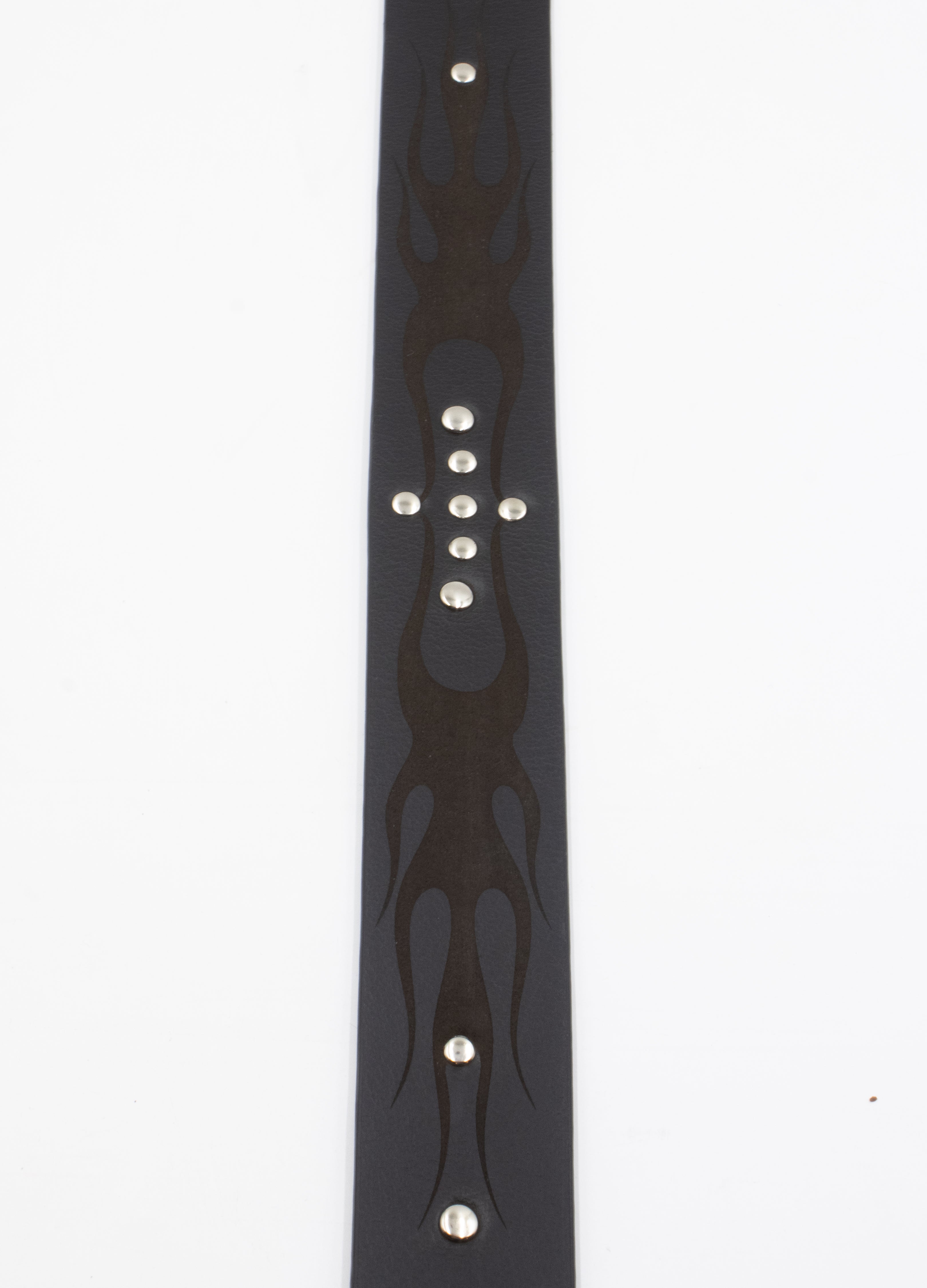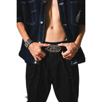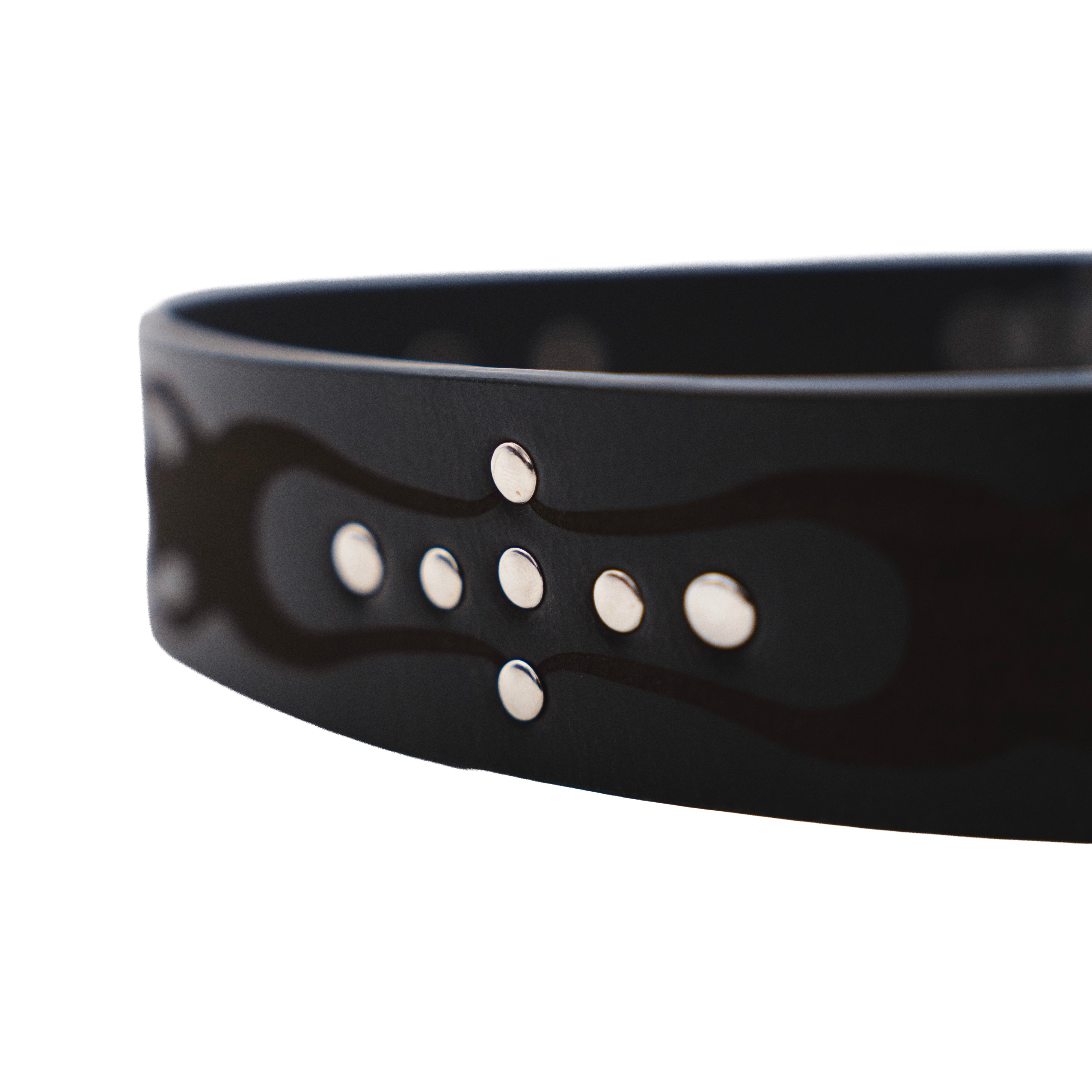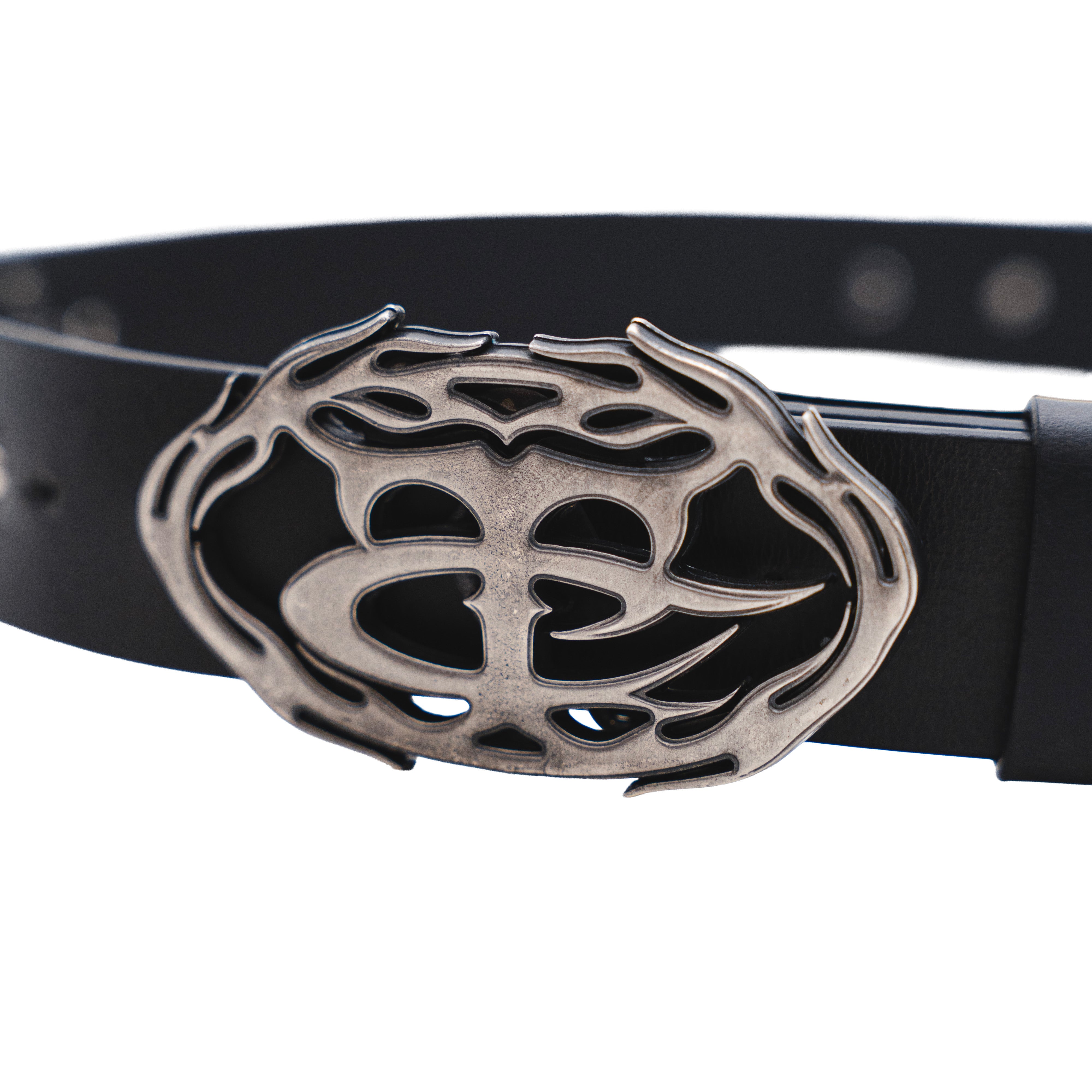 Este cinturón está elaborado en piel negra de alta resistencia y herrajes en plata envejecida. Presenta una hebilla de placa robusta y detalles de grabados detallados que fusionan la estética de ambas marcas.