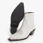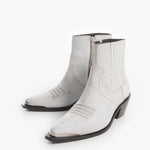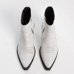 Bota (botín) tipo Chelsea, fabricada en piel de res blanca en acabado de gamuza craquelada, con efecto desgastado. Botín de tacón cubano, relieves bordados en el empeine, elástico tablillado, cierre metálico lateral y acabados metálicos en talón y punta.