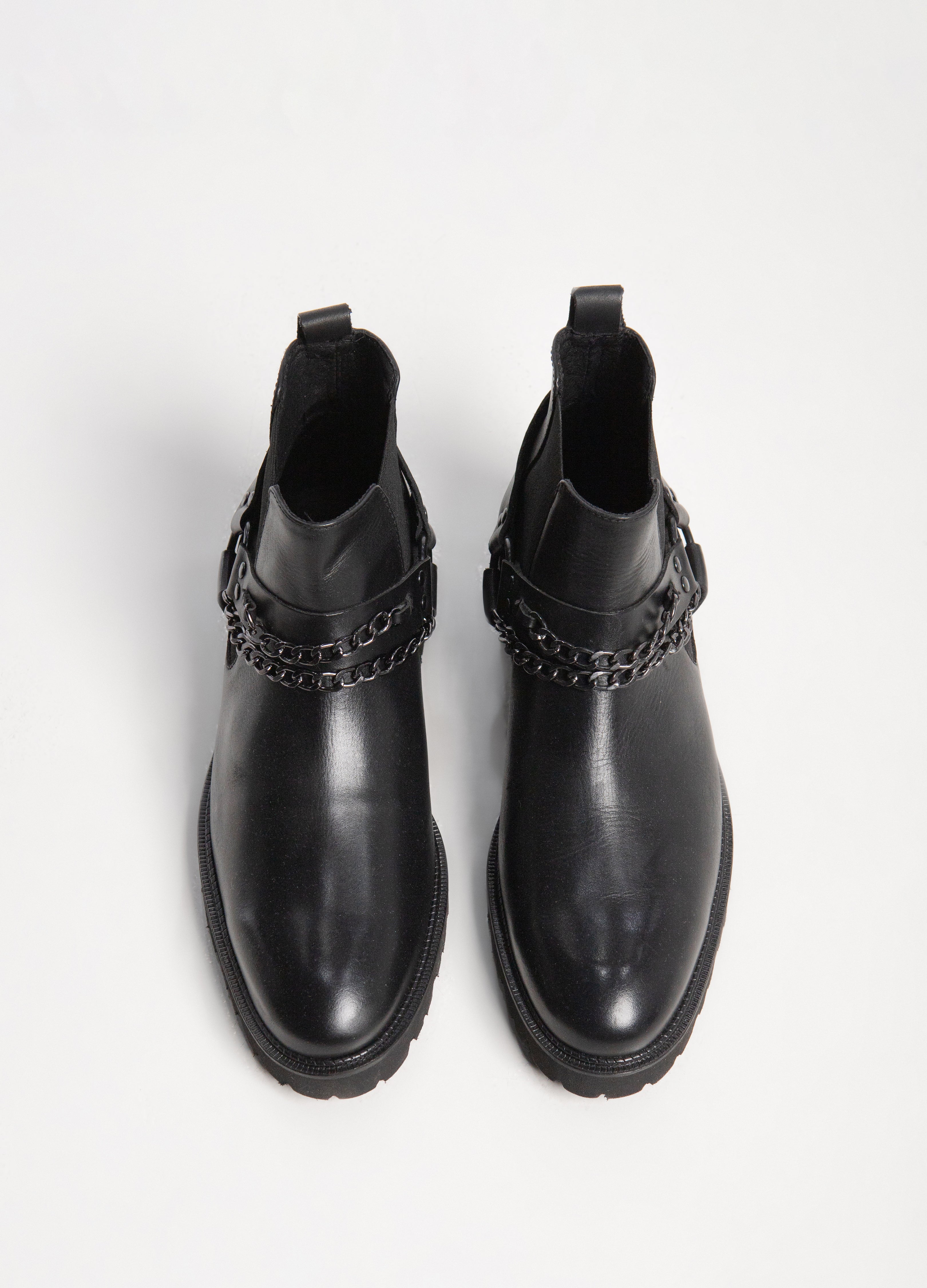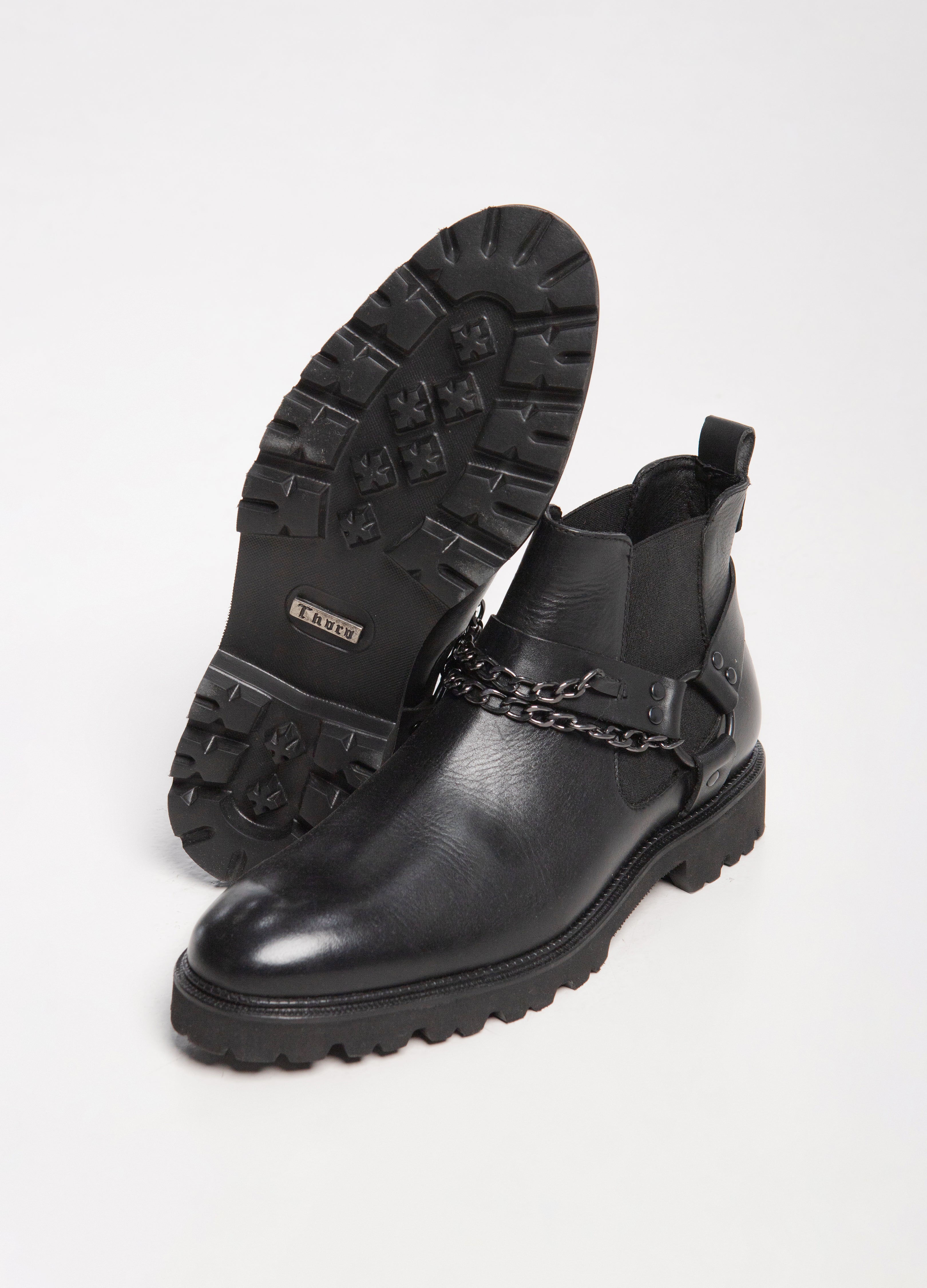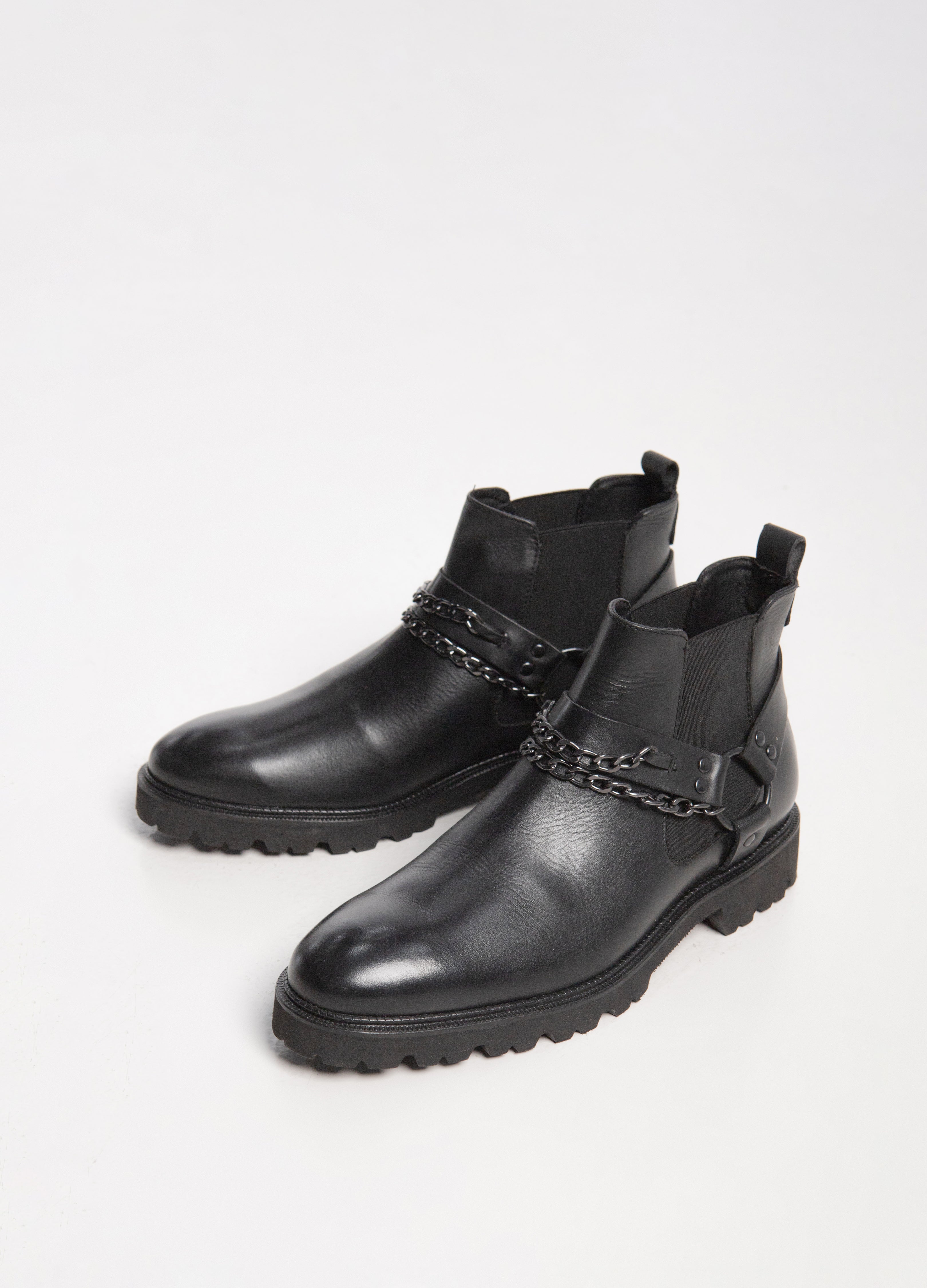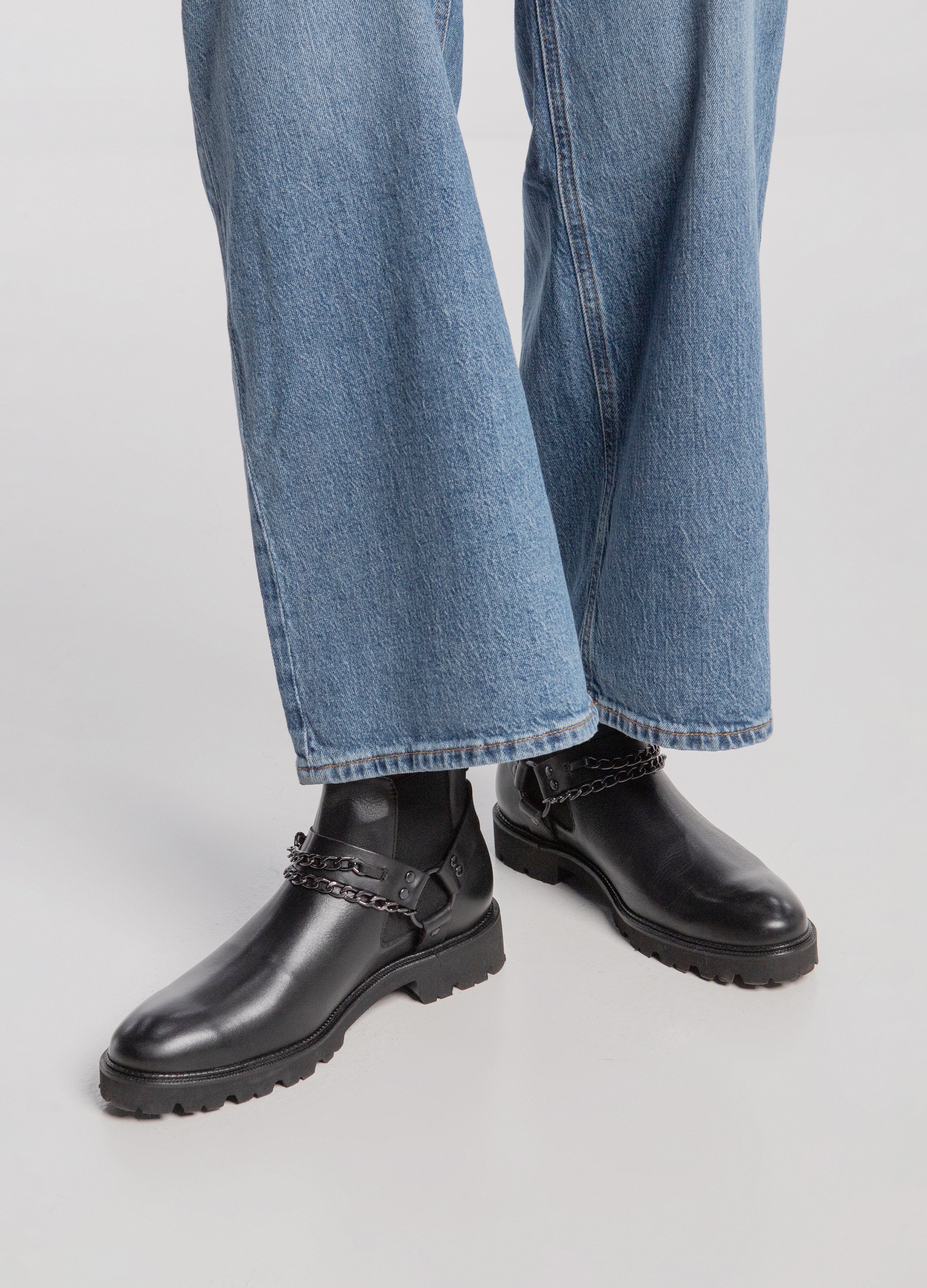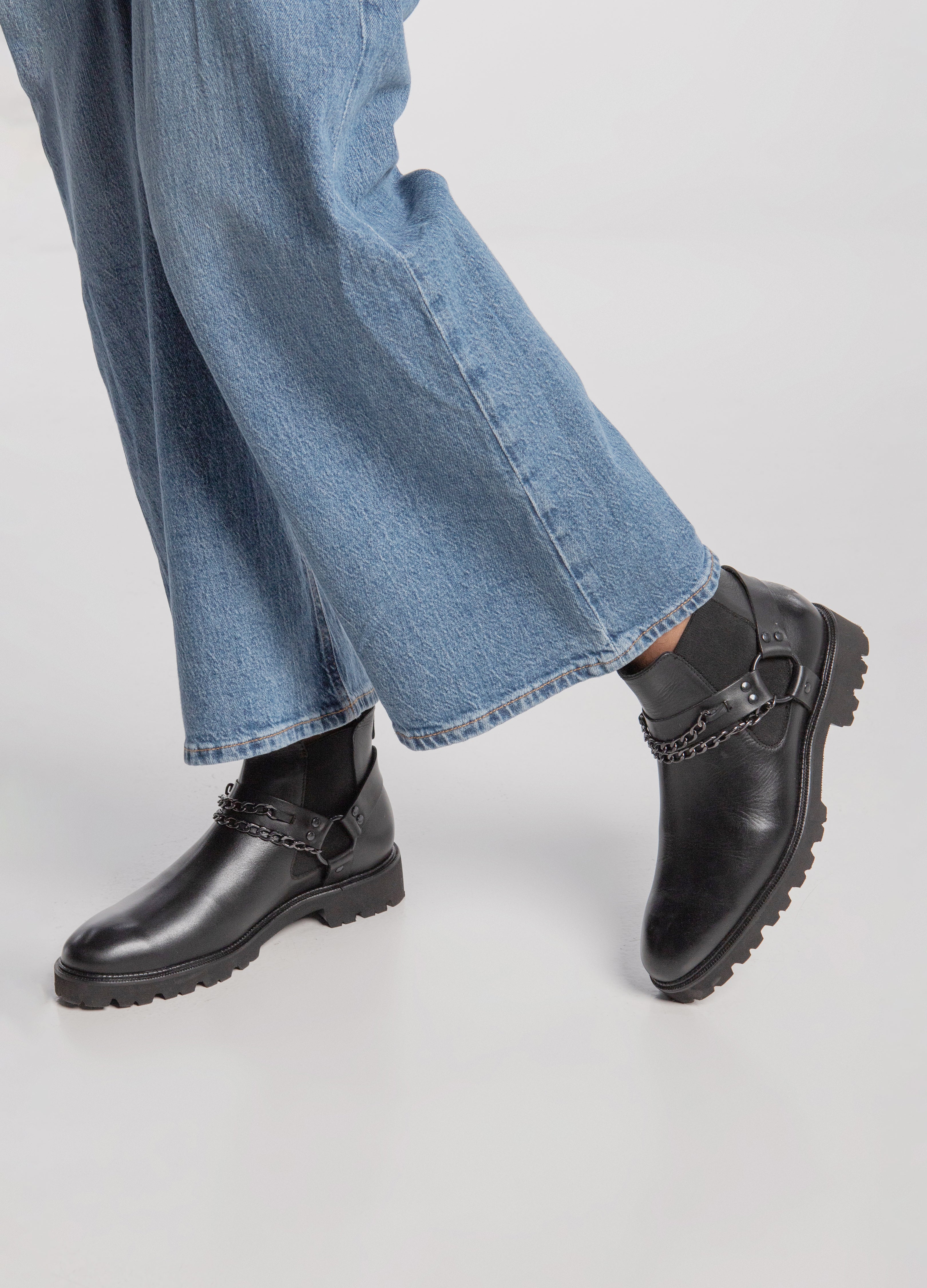 Botín tipo Chelsea en color negro, con suela chunky, fabricado en piel de res, arnés, argolla y cadenas delanteras.